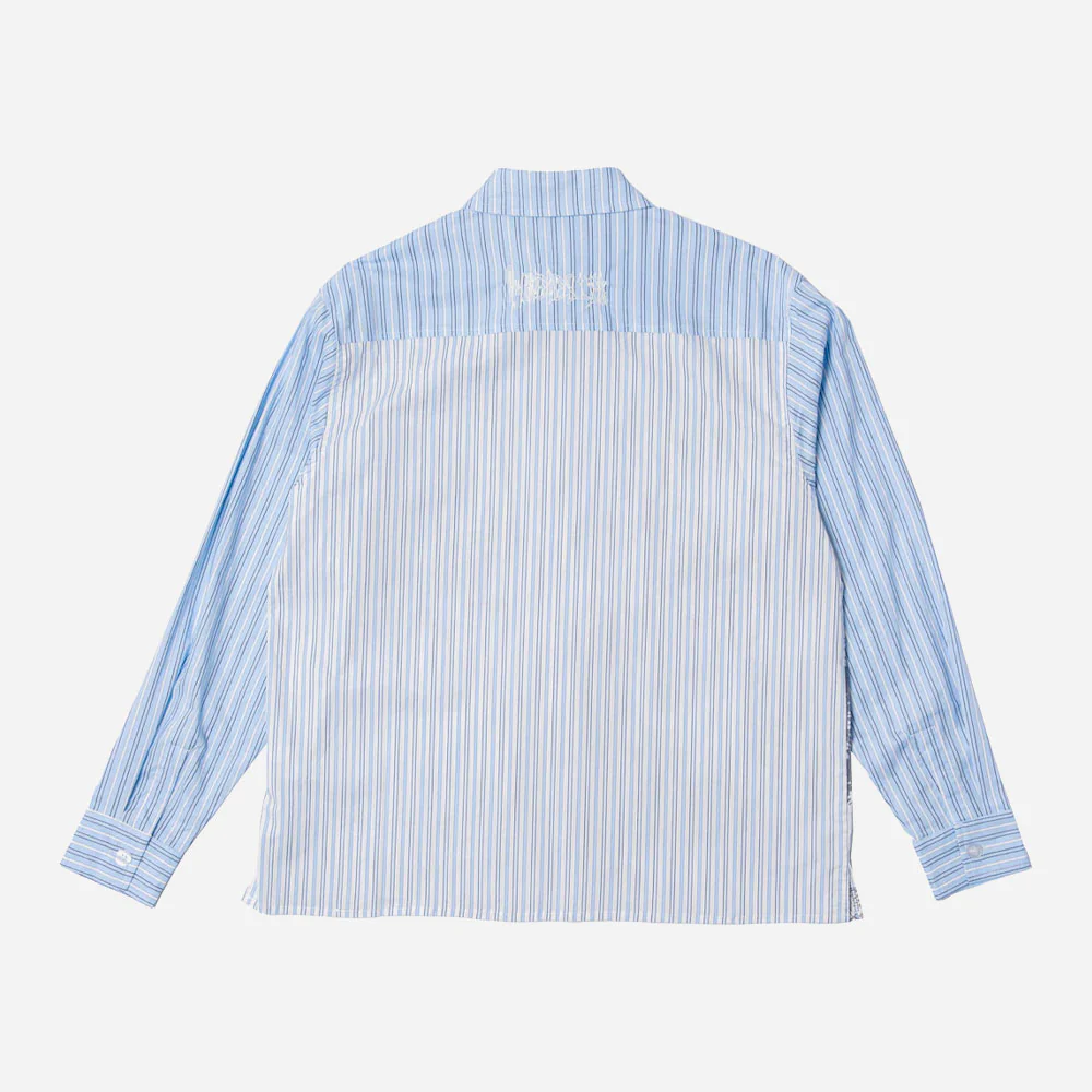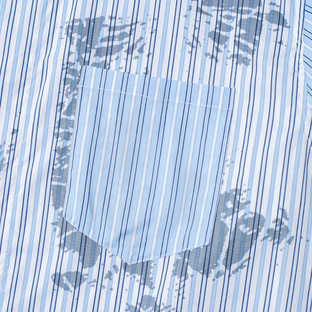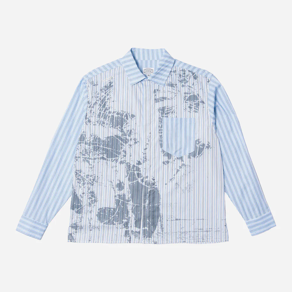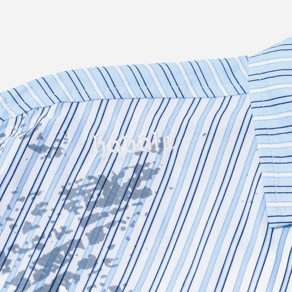Chemise Hoddle, coupe droite classique avec manches longues, col ouvert et décontracté. Patte de boutonnage avec boutons nacrés cachés. Broderies ton sur ton sur le devant et dans le dos. Fabrication en coton à rayures avec large sérigraphie sur le devant, réalisée en collaboration avec Marli Maddison.