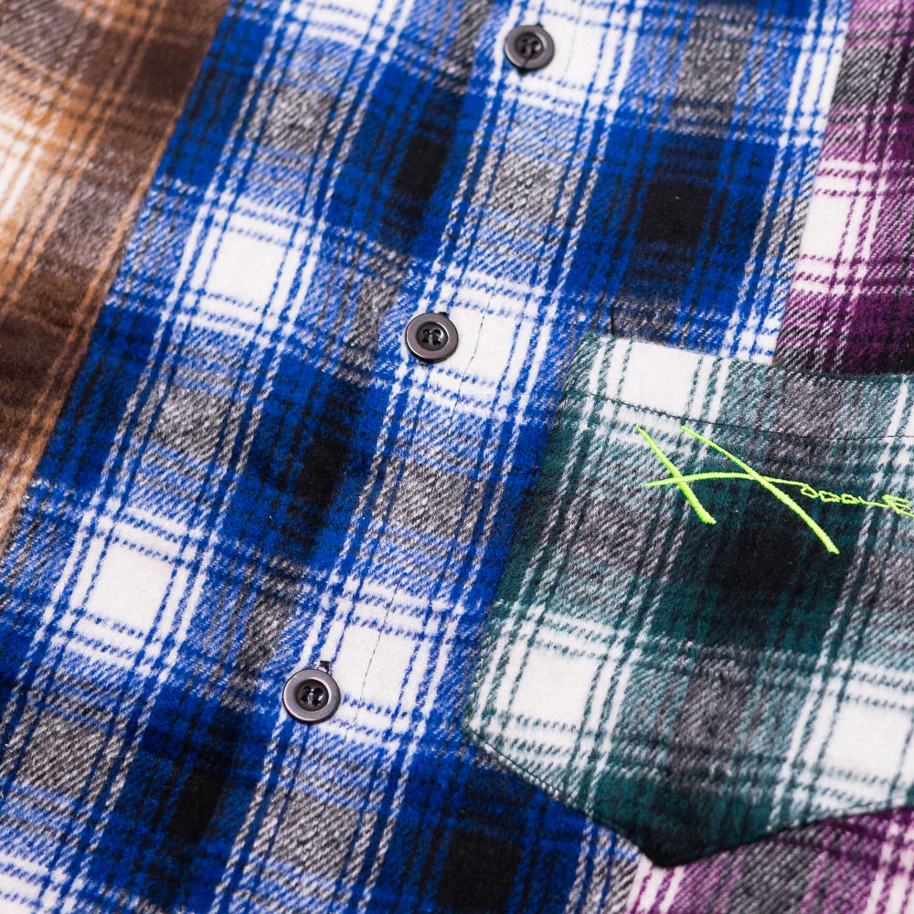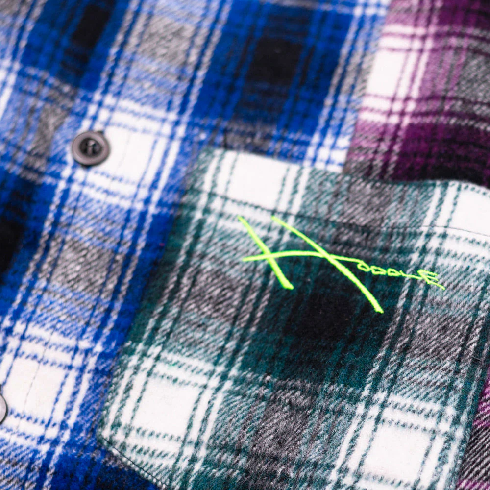 Cette chemise en flanelle de poids moyen présente une variété de motifs de flanelle frappants et une poche de poitrine unique. Le logo Hoddle brodé par l’artiste Benjamin Barretto ajoute une touche artistique. La chemise se ferme par des boutons pour un look classique.