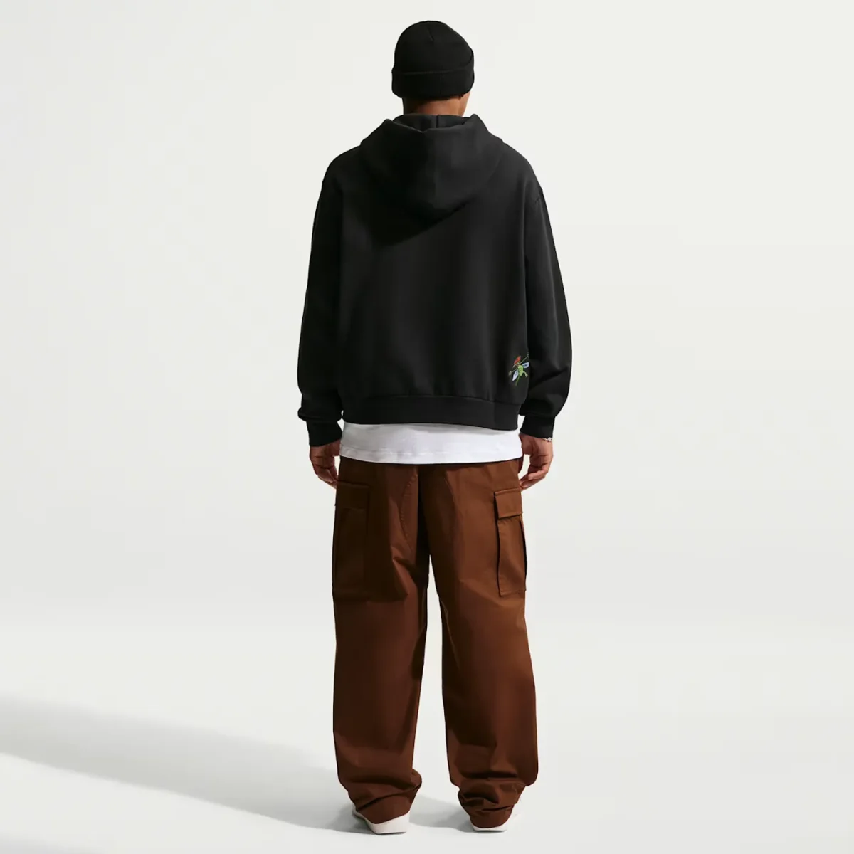 Le Hoodie Zippé Nike SB Souvenir réinvente le classique sweat noir avec une dose d’irrévérence et de créativité. Fabriqué dans un tissu Fleece brossé épais (Heavyweight), il offre cette sensation de lourdeur rassurante et une chaleur immédiate. Sa coupe ample et ses épaules tombantes (drop shoulders) assurent un look « drapé » parfait pour rider ou chiller.