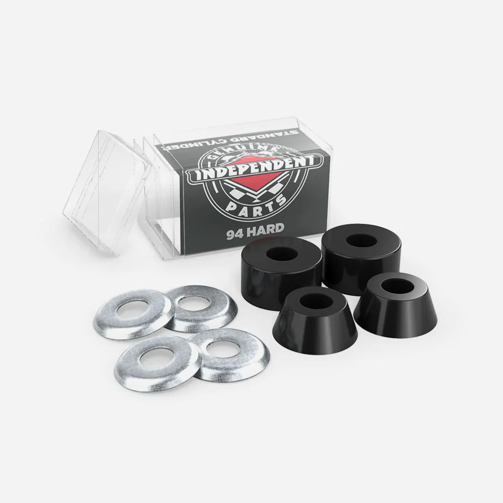 Kit de gommes pour trucks de skateboards Independent. Elles sont faites à partir d’uréthane à très haut rebond, spécialement formulée pour obtenir une haute performance avec peu de rodage. Elles s’adaptent à tous les Trucks Independent ainsi qu’ la majorité des autres marque comme Venture et Thunder. L’ensemble comprend 2 gommes supérieures coniques et 2 gommes inférieurs cylindriques, ainsi que 2 coupelles hautes et 2 basses.
