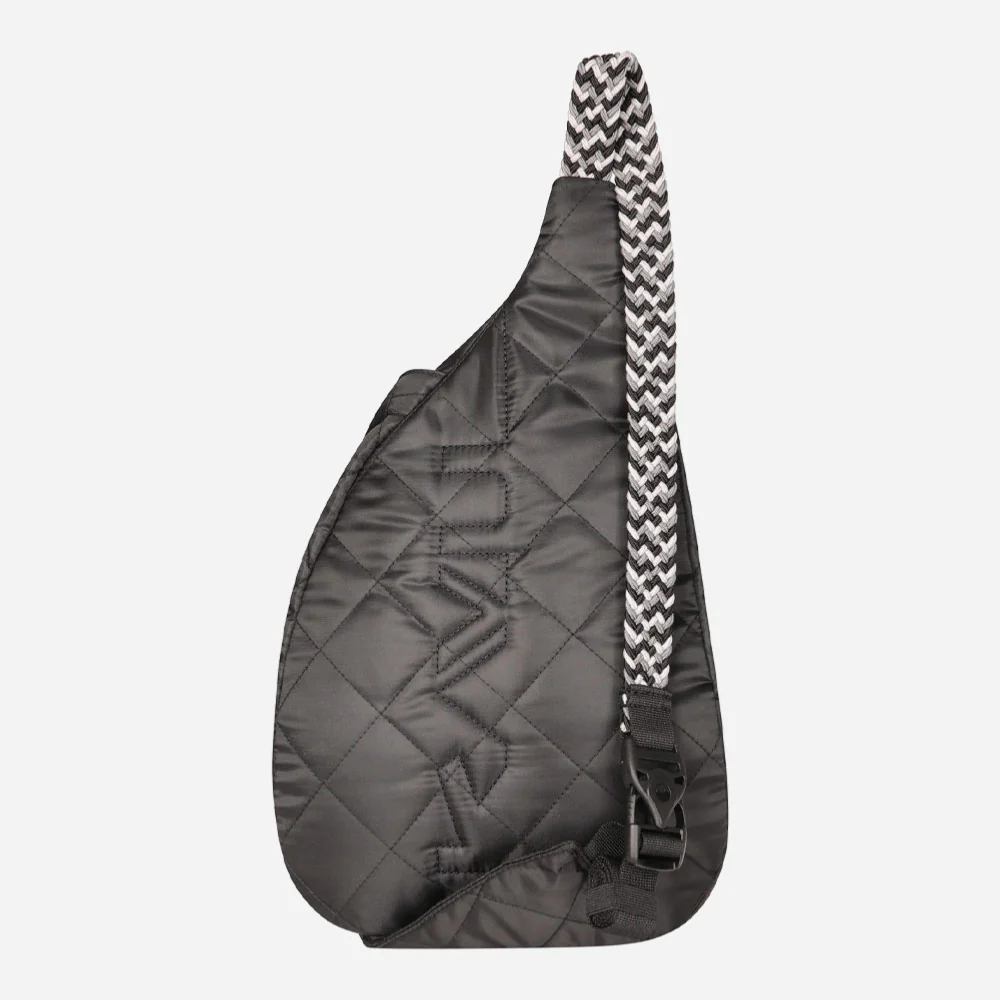 Ce mini sac en bandoulière matelassé diamant est doté d’une bandoulière réglable en corde élastique tressée avec boucle latérale, de deux compartiments zippés verticaux, de deux poches pour clés ou téléphone portable, d’un dos matelassé avec broderie KAVU.