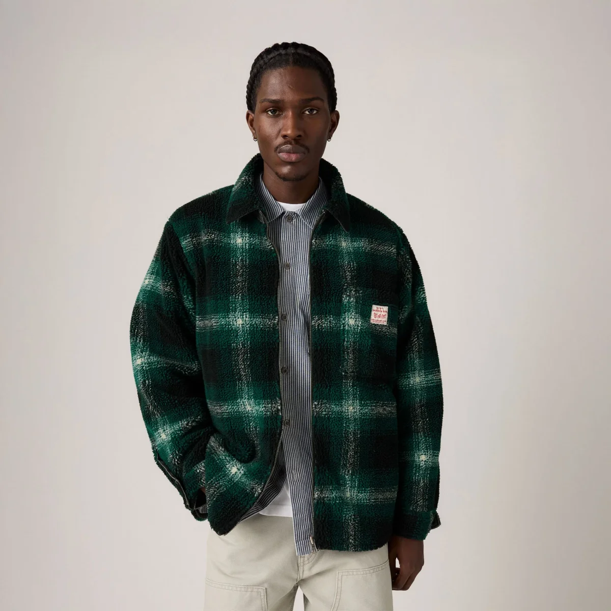 D’un côté, un look workwear en denim brut à poches plaquées, de l’autre un motif carreaux sherpa vert et noir au style vintage. Une pièce polyvalente qui allie l’ADN utilitaire Levi’s à une esthétique contemporaine.
