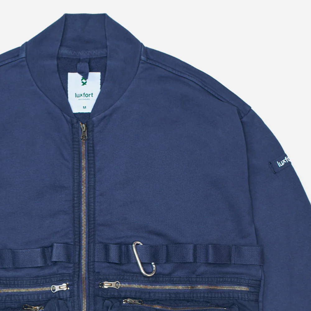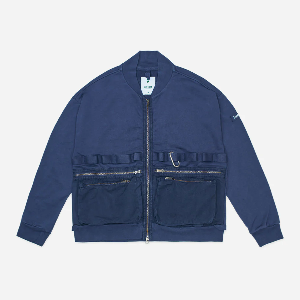 Cette silhouette classique de bomber zippé est le parfait équilibre entre nouveauté et tradition. L’avant et les poches sont en coton sergé avec fermetures à glissière métallique YKK, alors que l’arrière et les manches sont en coton jersey épais. fermeture principale par glissière métallique YKK. Finition avec des boucles utilitaires en coton sergé à l’ourlet et bandeau LUXFORT® sur la manche. De plus il est réalisé dans un coton américains épais de première qualité avec un traitement naturel overdye, lui donnant une couleur profonde et contrastée. Et pour ne rien gâcher, le tout est fabriqué en Europe.