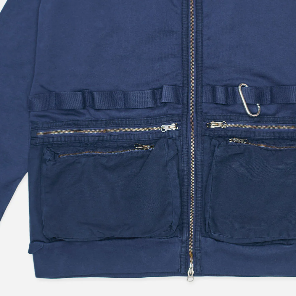 Cette silhouette classique de bomber zippé est le parfait équilibre entre nouveauté et tradition. L’avant et les poches sont en coton sergé avec fermetures à glissière métallique YKK, alors que l’arrière et les manches sont en coton jersey épais. fermeture principale par glissière métallique YKK. Finition avec des boucles utilitaires en coton sergé à l’ourlet […]