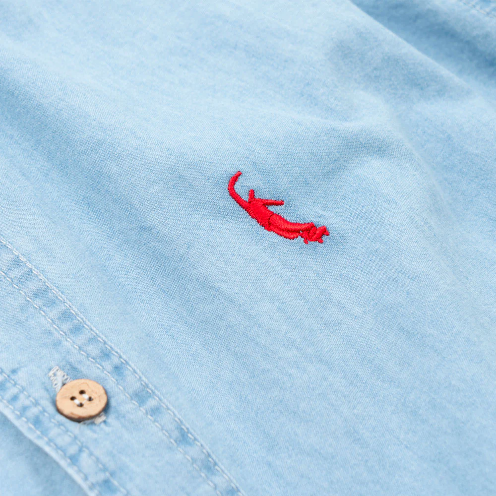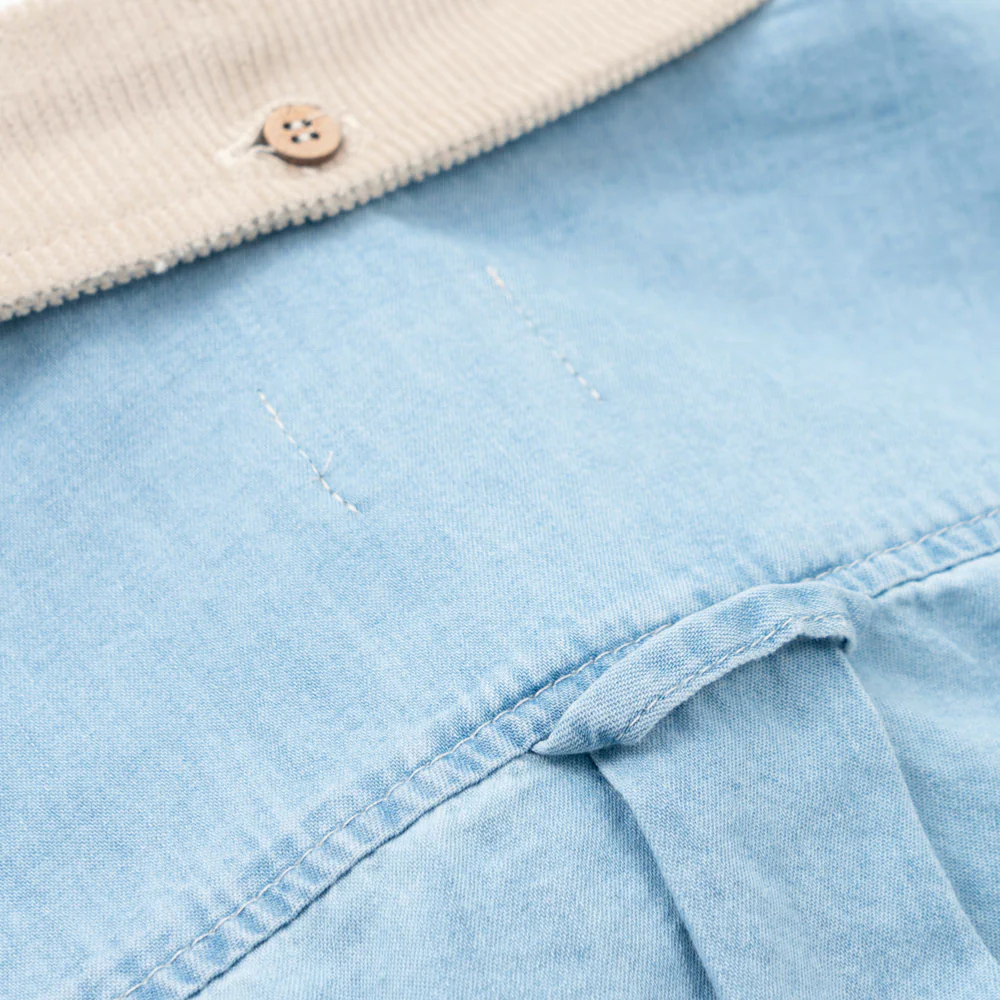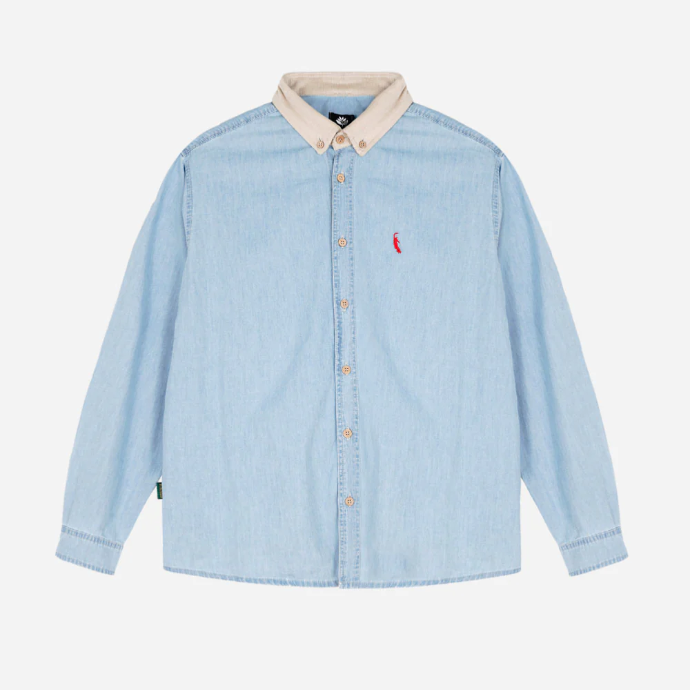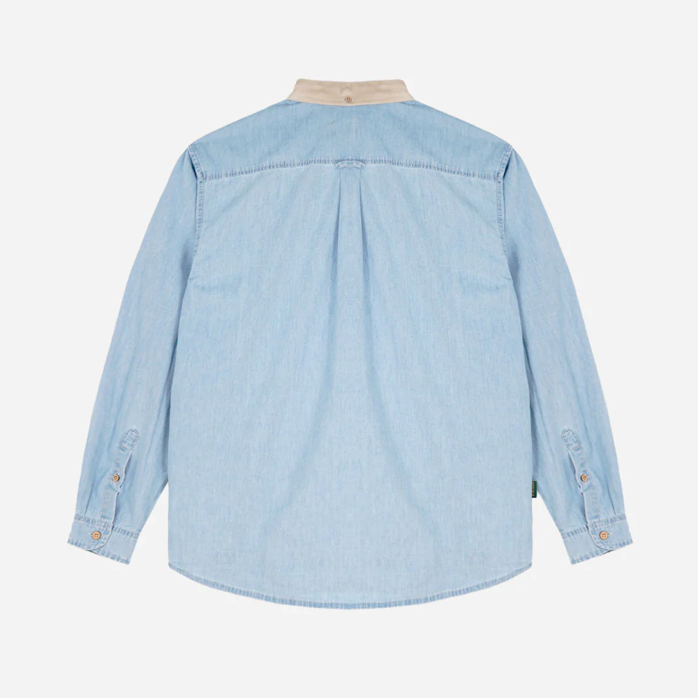 Chemise manches longues en denim avec col velours cotelé, coupe 90’s, fermeture par boutons imitation corne, logo brodé sur la poitrine et patch Magenta à la taille.