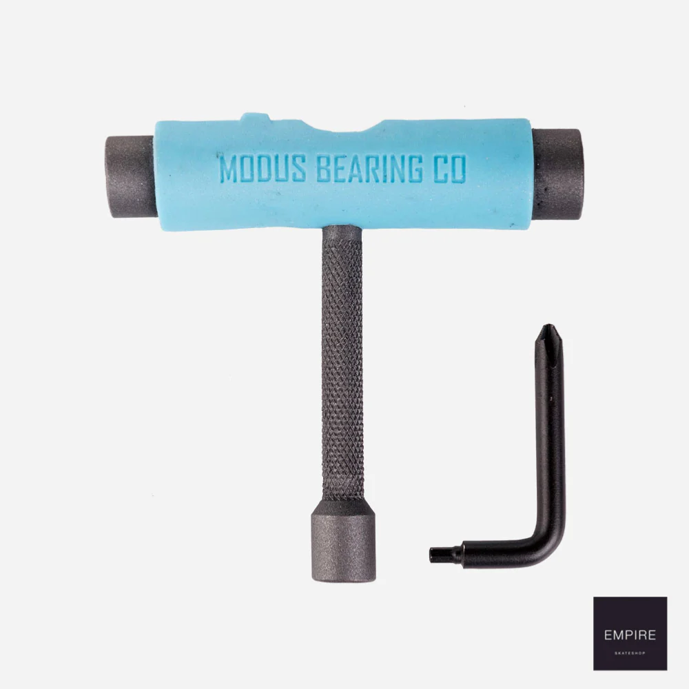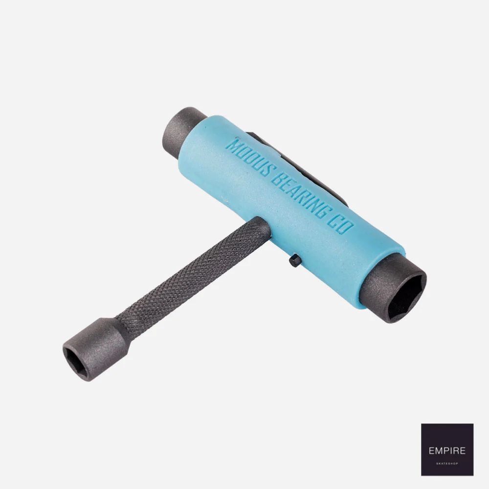 MODUS UTILITY TOOL – Blue Outil compact contenant toutes les clefs utiles pour monter et régler votre skateboard. Fabrication acier avec poignée gainée en plastique. Il contient une clef pour les boulons ds kingpin, une clef pour les boulon d’axes et une clef pour le boulon des vis. Associé à une clef amovible avec un coté vis cruciforme et l’autre vis Allen.
