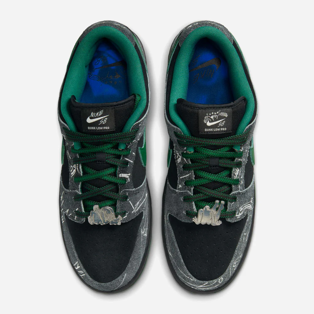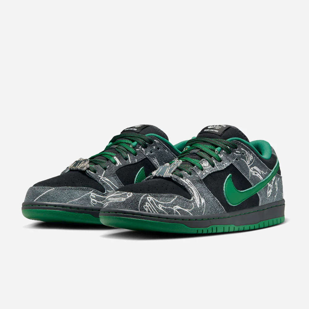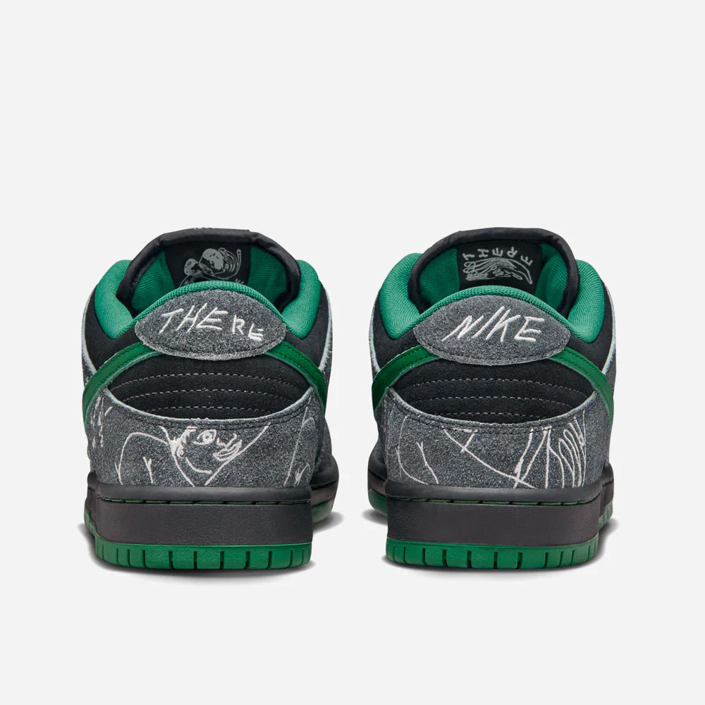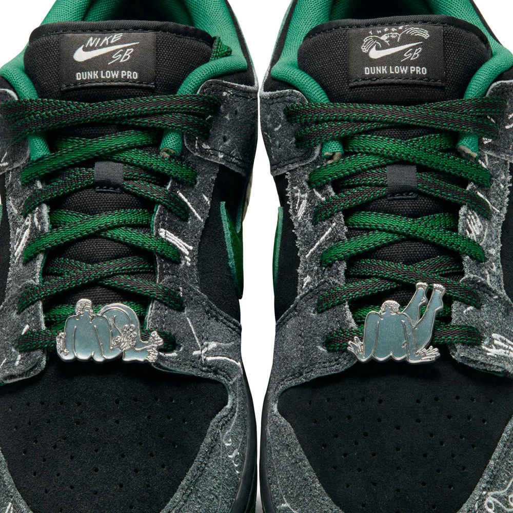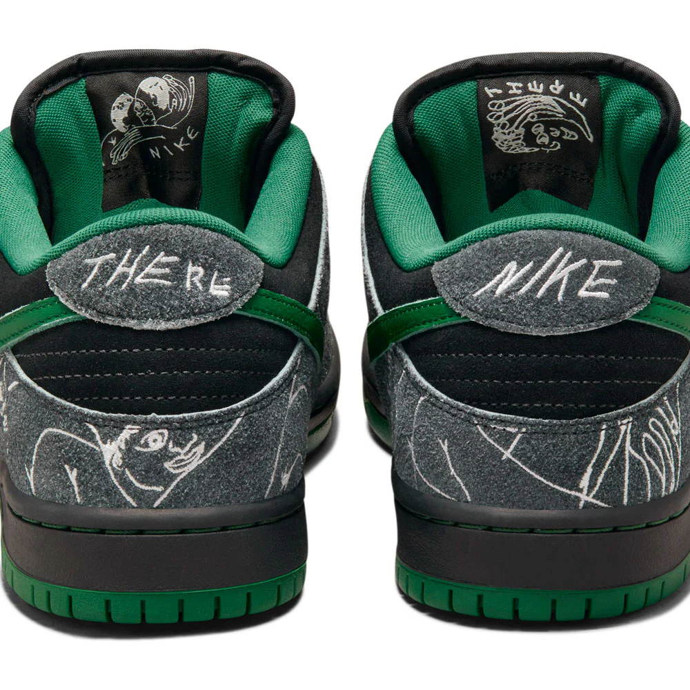 Enraciné dans la culture du skate, le label There Skateboards s’associe à l’équipe Nike SB et dévoile sa propre Dunk Low. There Skateboards est un collectif 100% queer qui défend les valeurs et les droits LGBTQIA+. Grâce à ses membres et à son activisme, il est devenu une référence dans la communauté. Aujourd’hui, en s’associant à l’équipe de skateboard du Swoosh, son impact et sa visibilité se renforcent encore. Réalisée dans les règles de l’art, la chaussure se compose d’une base noire et de superpositions en daim poilu. Finement brodées, les surpiqûres blanches mettent subtilement en valeur les visuels officiels de la marque, également reproduits sur les deubrés argentés. Parmi les autres caractéristiques, on trouve un swoosh en cuir vert, des lacets bicolores et une semelle extérieure recouverte d’une œuvre d’art. Pour sceller la collaboration, la marque There Skateboards est présente sur les talons.