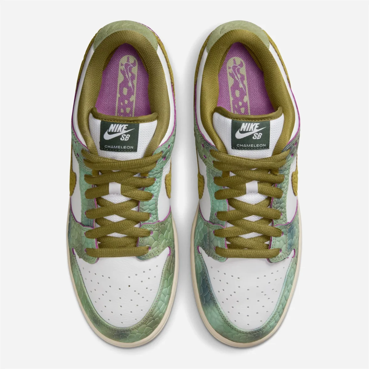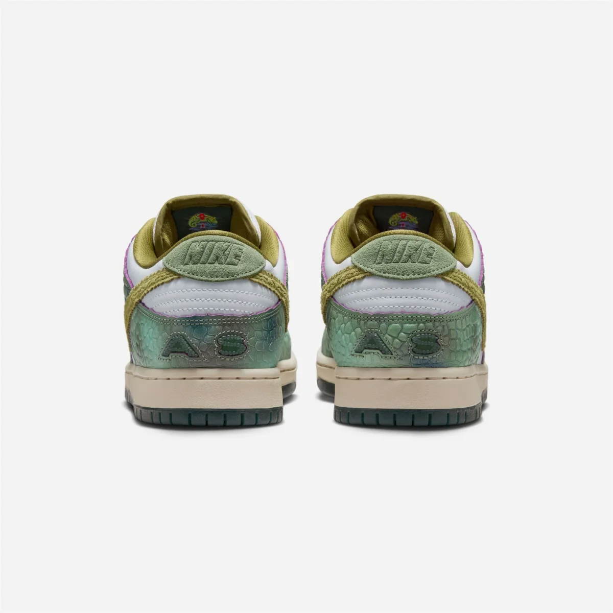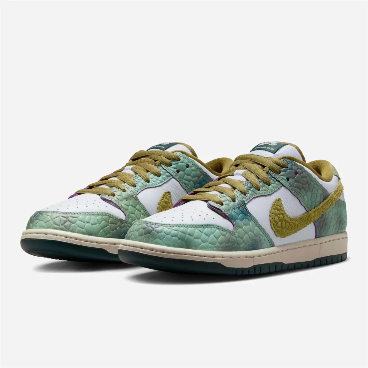 L’empeigne en cuir premium à motifs et en relief, les sous-couches en cuir tumble blanc et les Swooshes en daim imitent les écailles reptiliennes avec des superpositions bicolores qui révèlent une sous-couche fuchsia, propre à chaque skateurs. En plus d’un écusson personnalisé sur la languette et d’une illustration sur la semelle intérieure dessinée par Alexis, la Chameleon Dunk Low comporte un marquage « AS » caché à l’arrière du talon, une semelle intermédiaire marron avec une semelle extérieure teintée en vert vintage, et trois options de lacets.