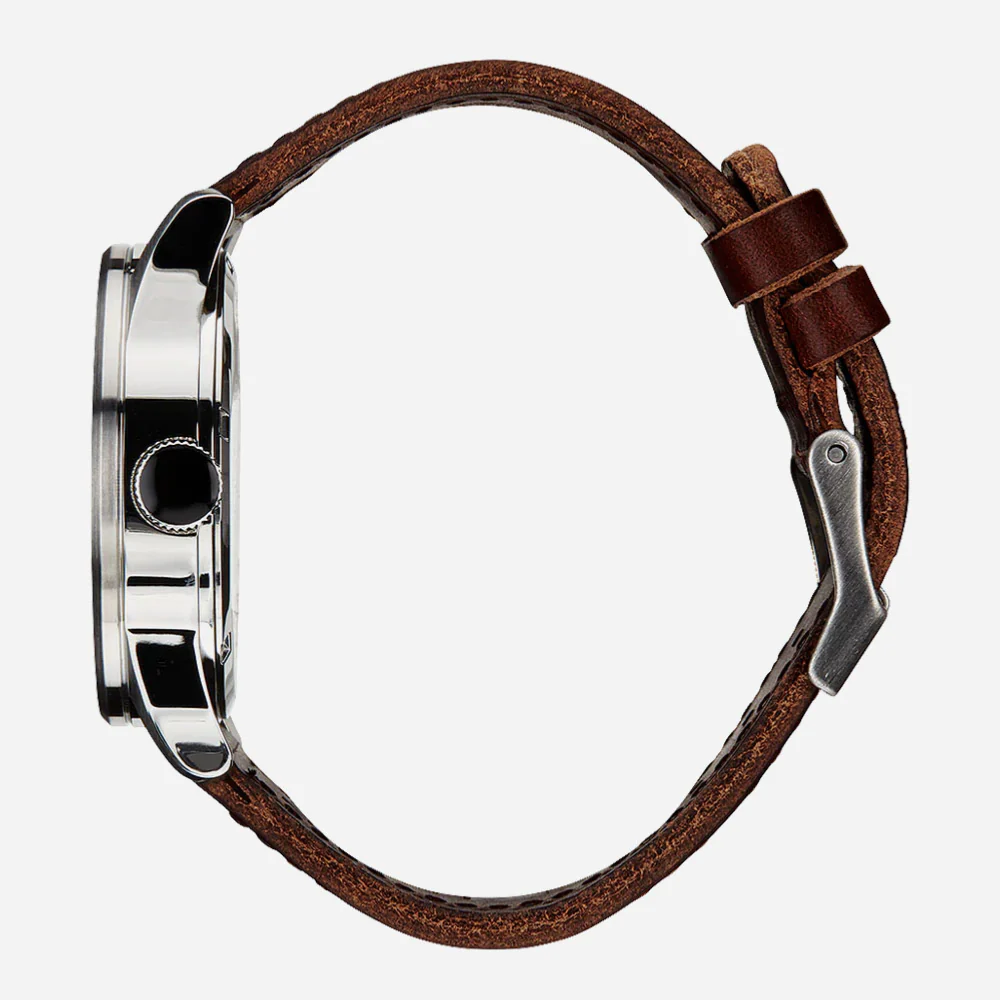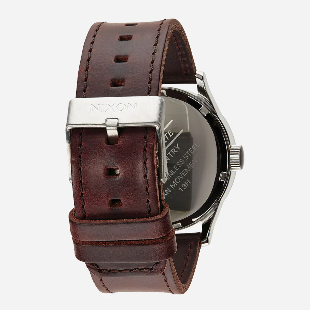 La Nixon Sentry Leather est une montre élégante avec un côté aventurier. Le cadran ressort avec de la profondeur et des détails mais, avec le boîtier en acier inoxydable robuste, le cristal minéral trempé et l’indice d’étanchéité de 100 m.