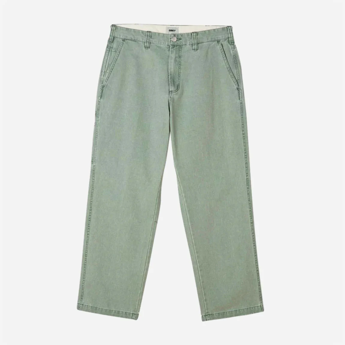 OBEY – HARDWORK CARPENTER PANT – Pigment Duck Green pantalon de travail en sergé avec fermeture à boutons et braguette à glissière poches avant en biais avec poches arrière plaquées et poches charpentier, étiquette « obey eyes » sur poche arrière droite du porteur fabriqué en 100% coton de 12 oz, coupe régulière et ouverture de jambe de 18 pouces, jambe droite.