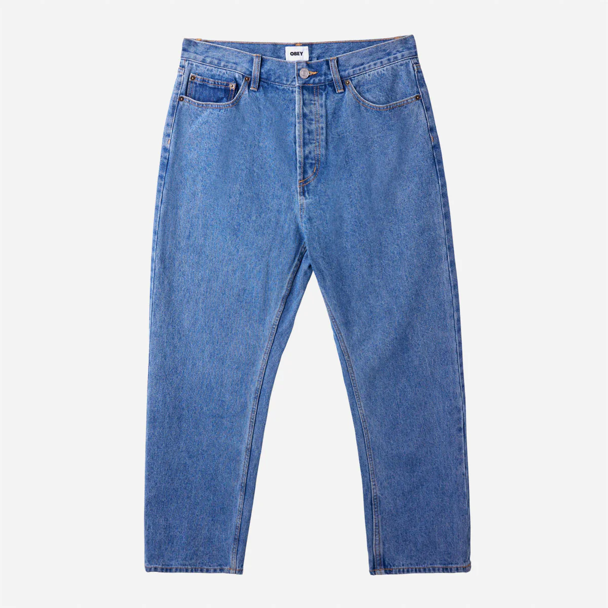 Jean 5 poches unisex, coupe droite relax, fermeture par boutons, patch Obey sur la poche arrière droite.