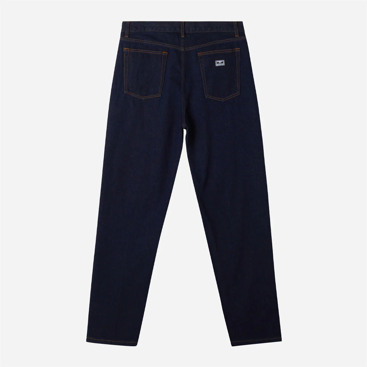 Jean 5 poches unisex, coupe droite relax, fermeture par boutons, patch Obey sur la poche arrière droite.