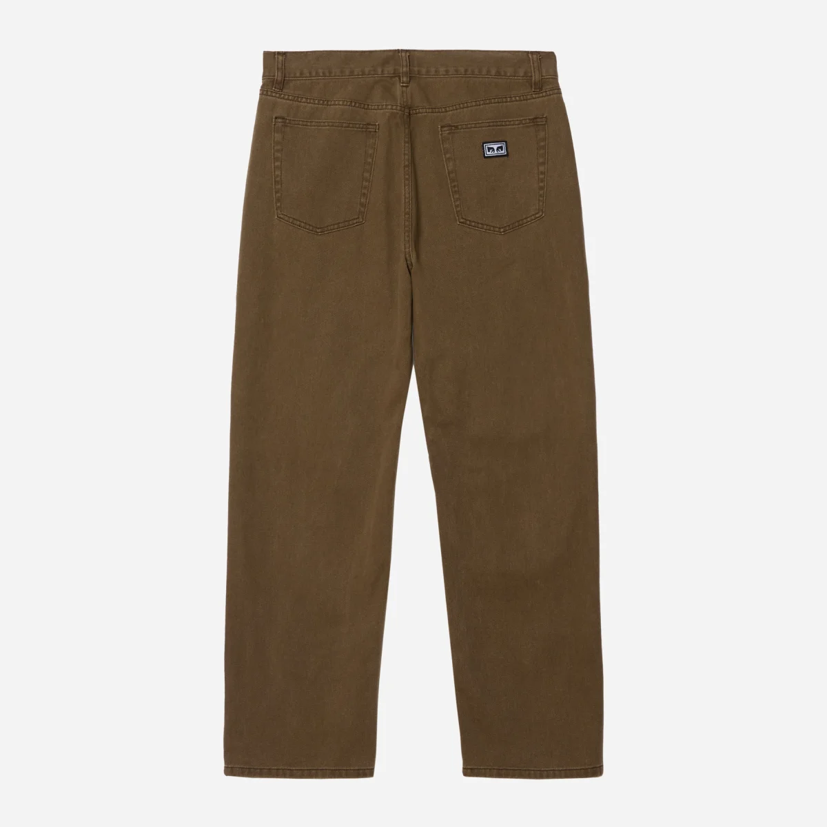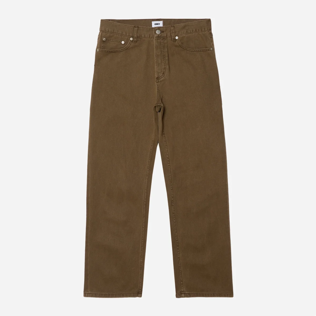 Jean 5 poches unisex, coupe droite relax, fermeture par boutons, patch Obey sur la poche arrière droite.