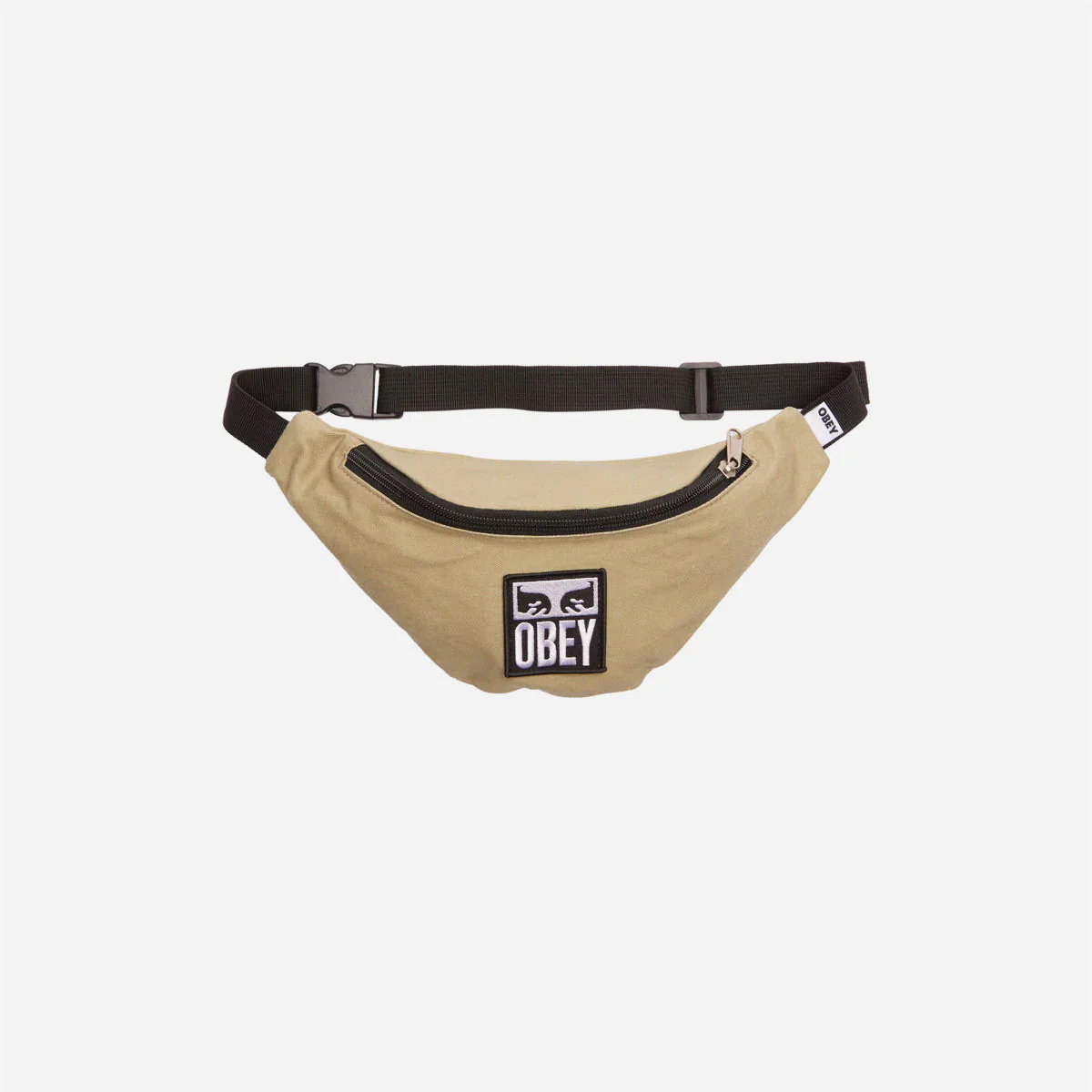 Petite sacoche banane en toile de coton, sangle ajustable, patch Obey cousu sur l’avant.