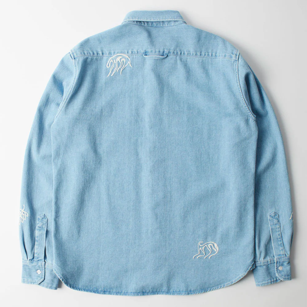Chemise en jean Parra coupe classique, avec visuel all-over. Petit label Parra sur le borde-cote bas.