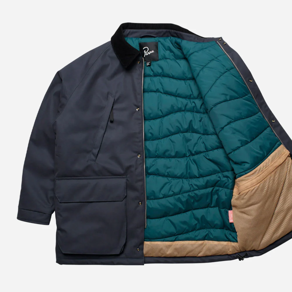 Parka Parra coupe chasseur avec col velours côtelé, larges poches à soufflets et poches poitrines en biais. Fermeture par boutons à pression et glissière métallique. Doublure isolante matelassé. Logo Parra brodé sur l’épaule gauche.