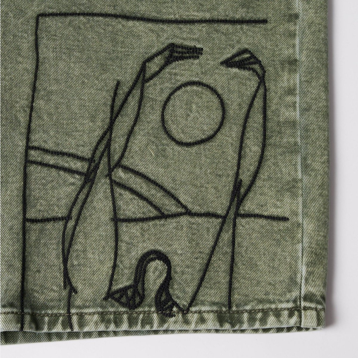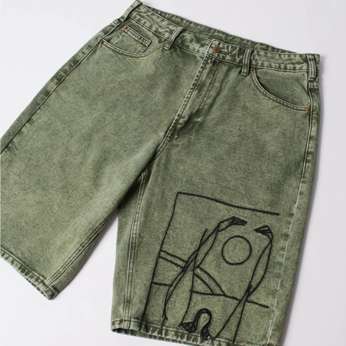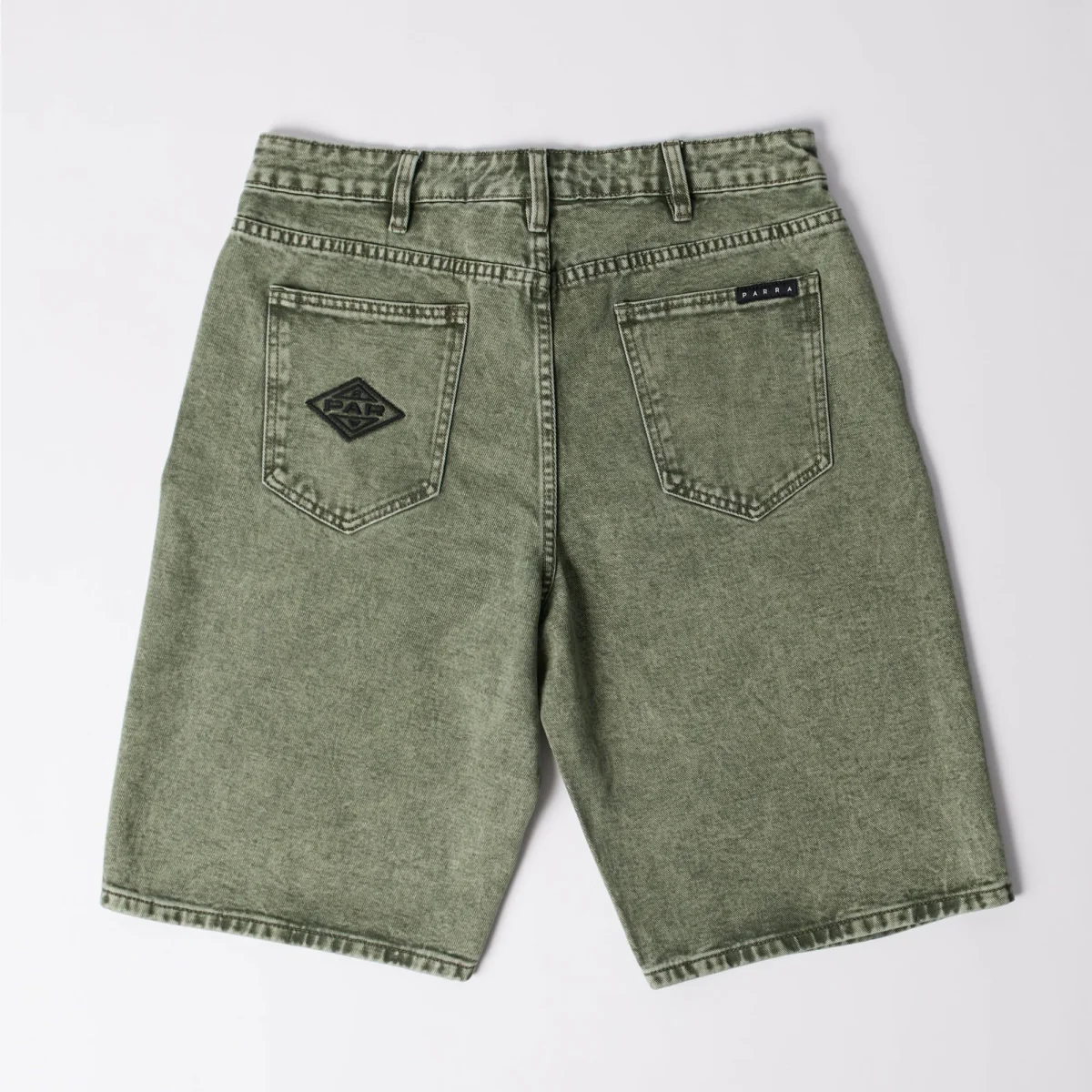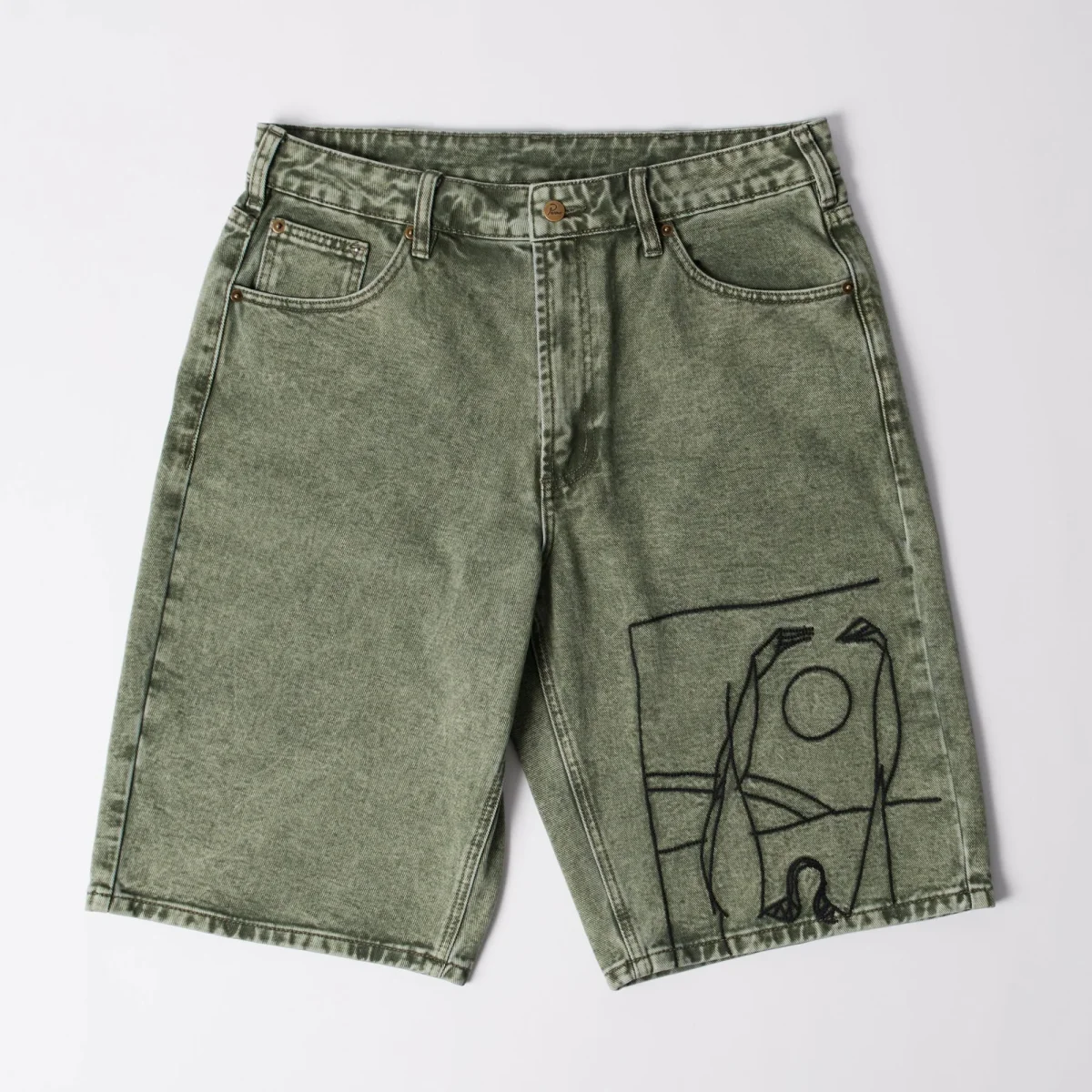 Short Parra fabriqué en toile de jean délavée. Coupe 5 poches ample qui arrive aux genoux. Multiples broderie reprenant visuels et logos Parra.