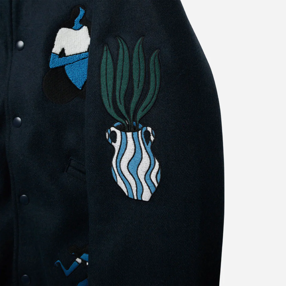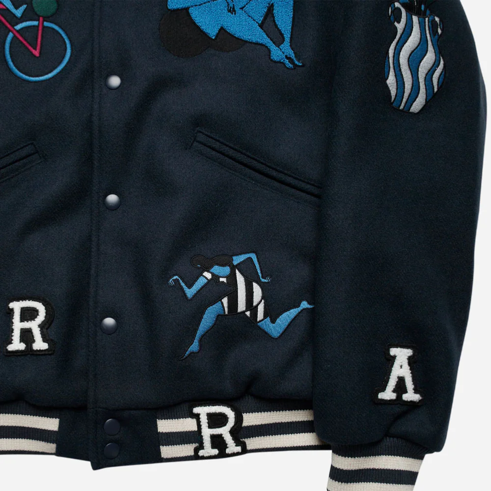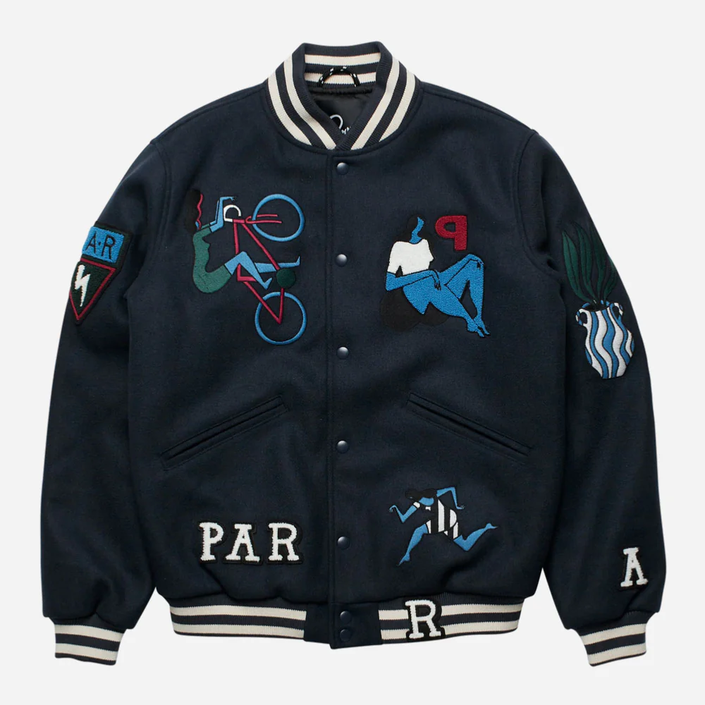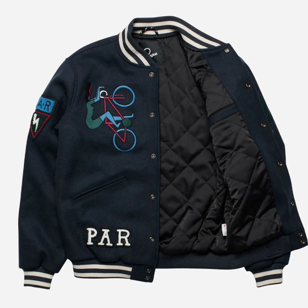 Veste Parra en drap de laine bouillie avec divers logos Parra brodés. Fermeture par boutons à pression et doublure satin matelassé avec rembourrage 3M Thinsulate. Poches extérieures passepoilées et poche intérieure poitrine.