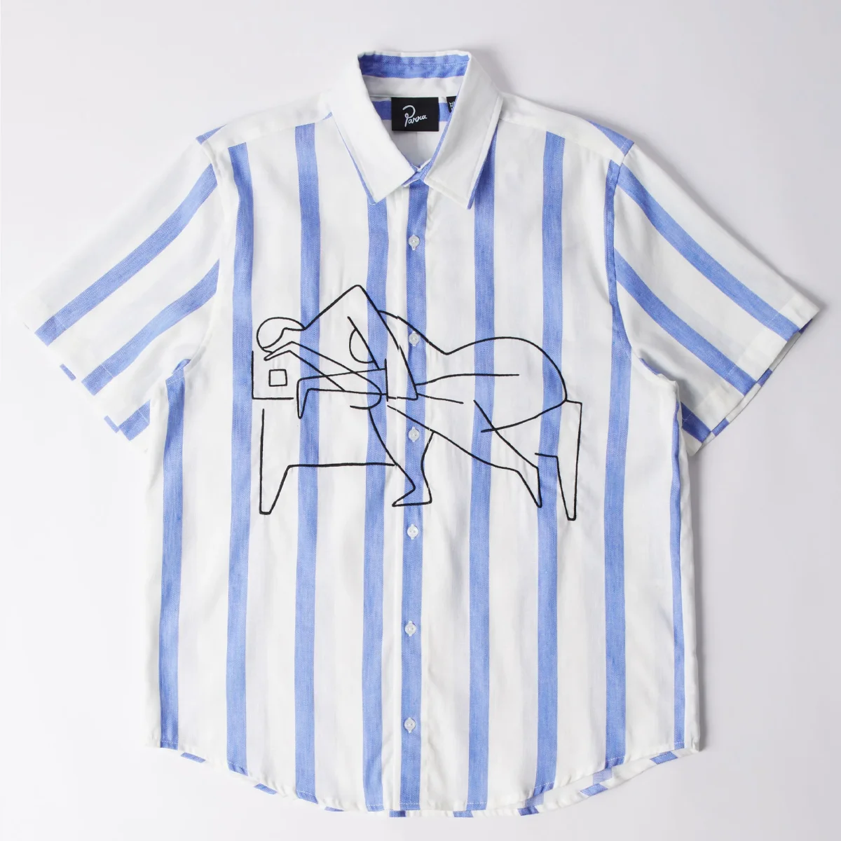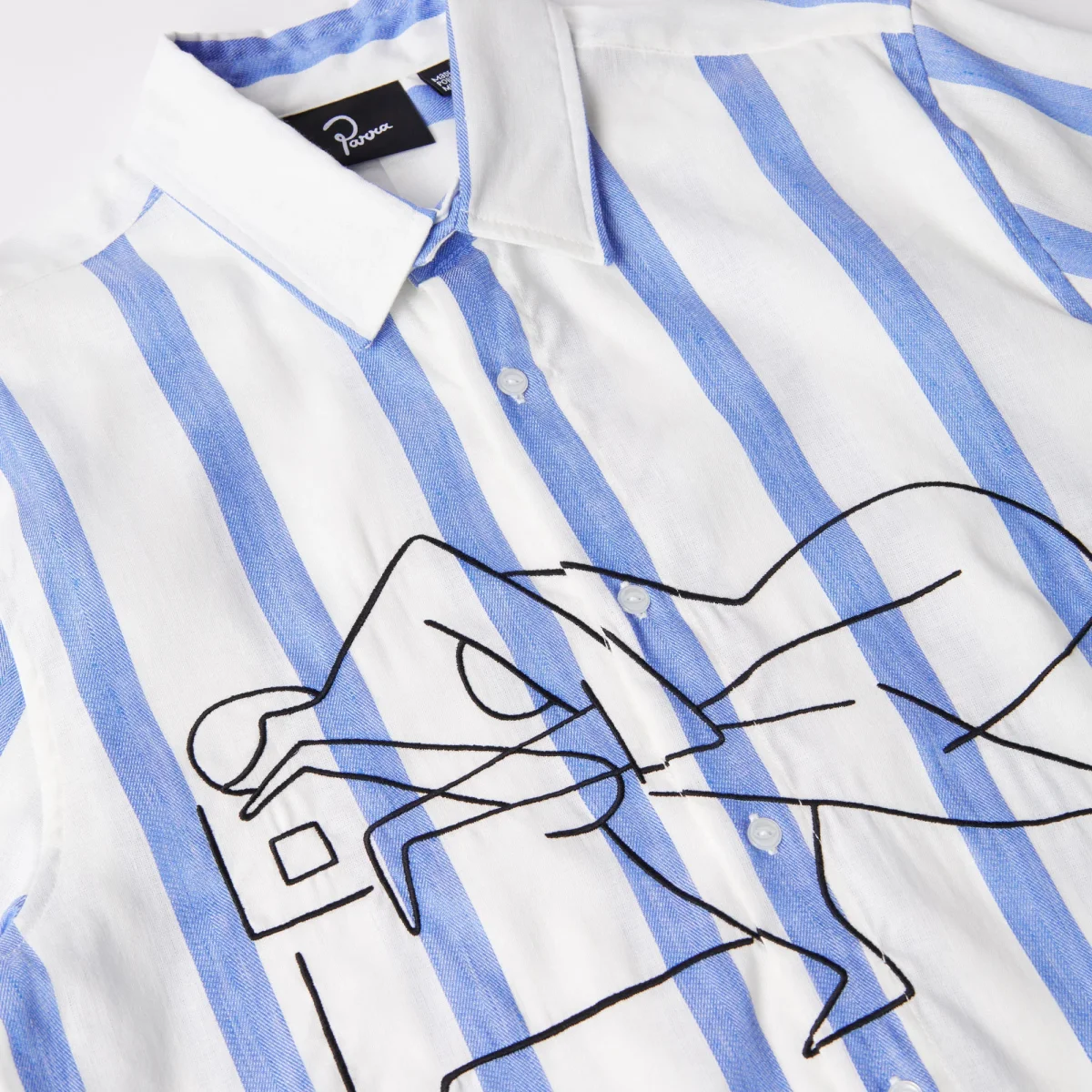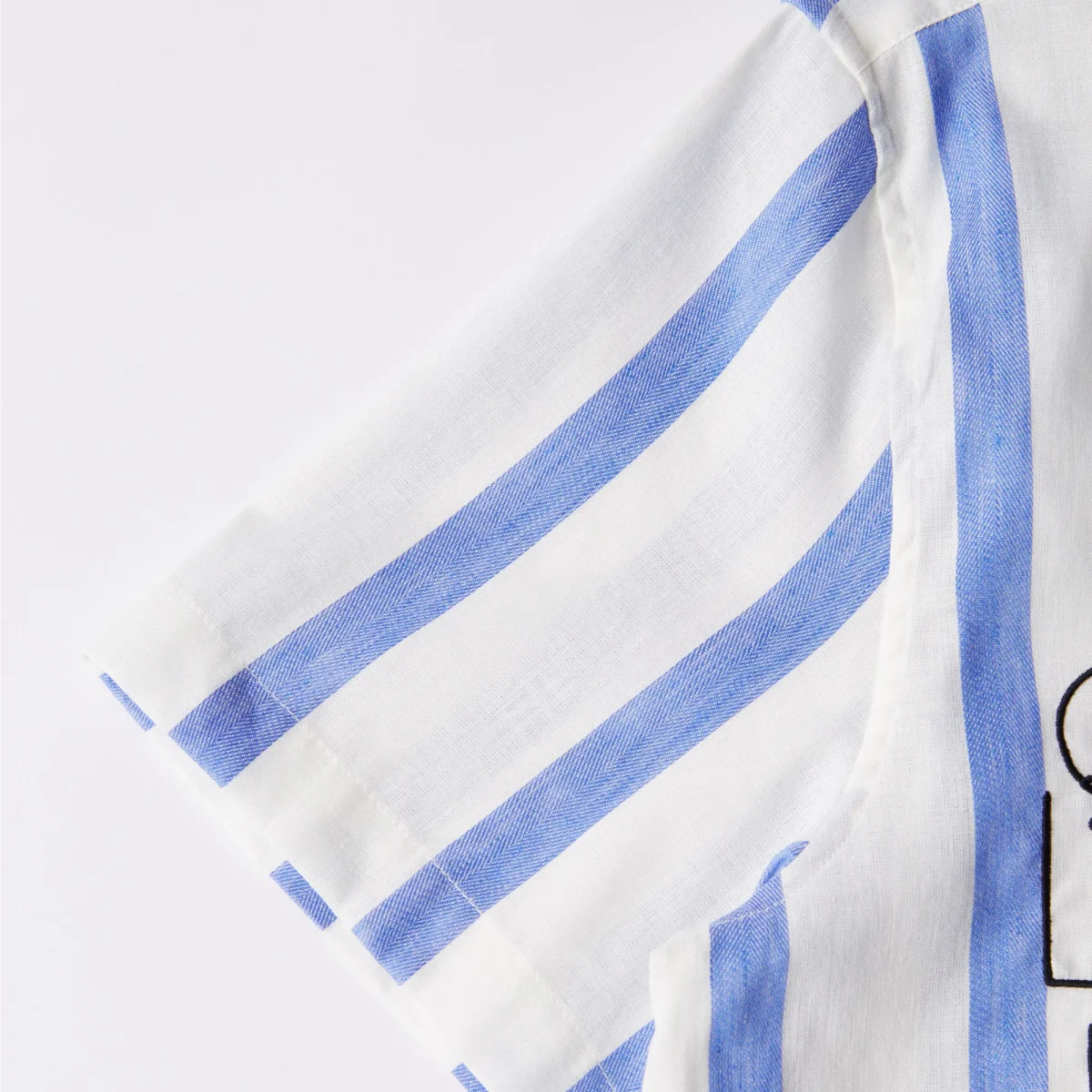 Chemise Parra manches courtes à rayures, coupe classique, fabrication en mélange de lin et visuel de l’artiste brodé sur le devant.