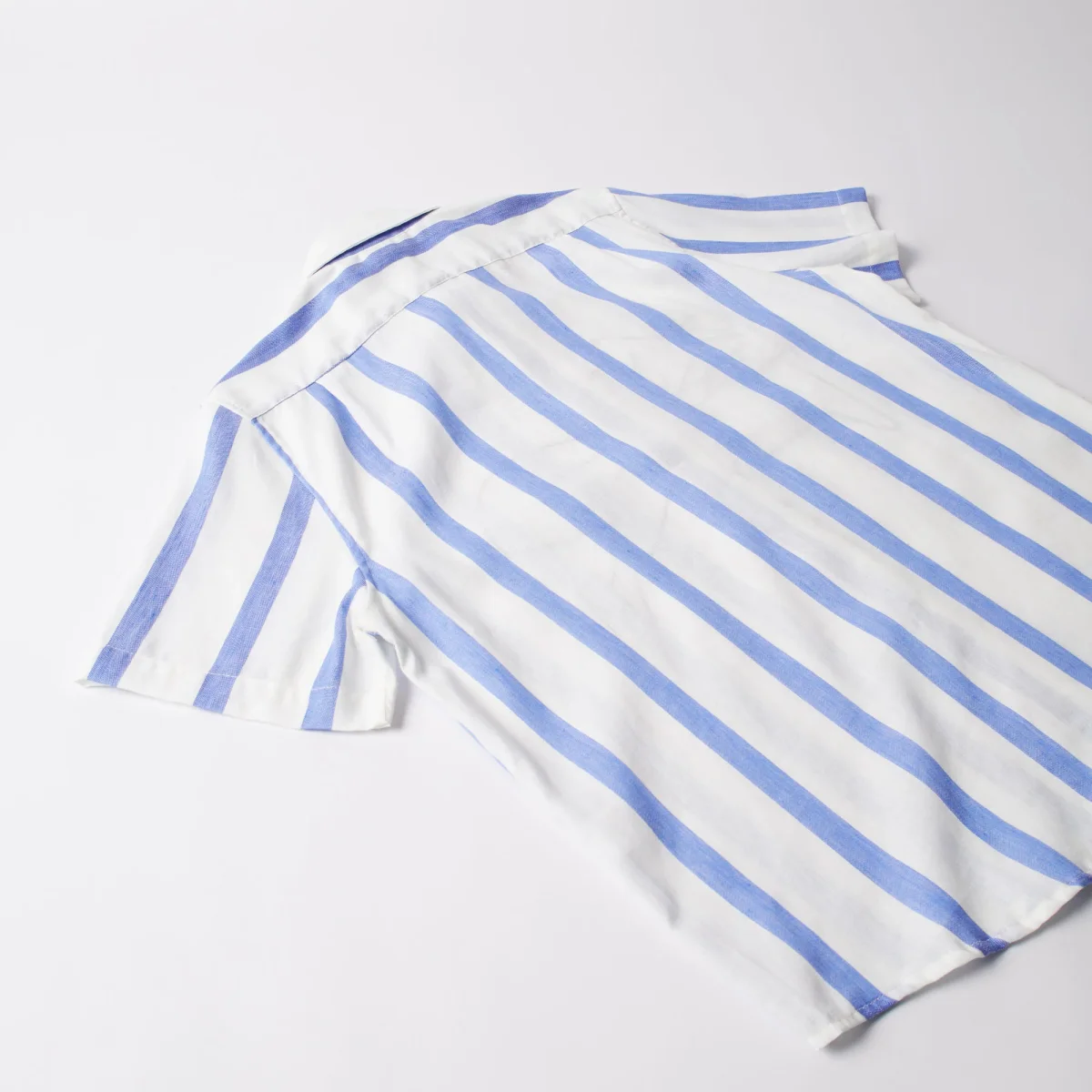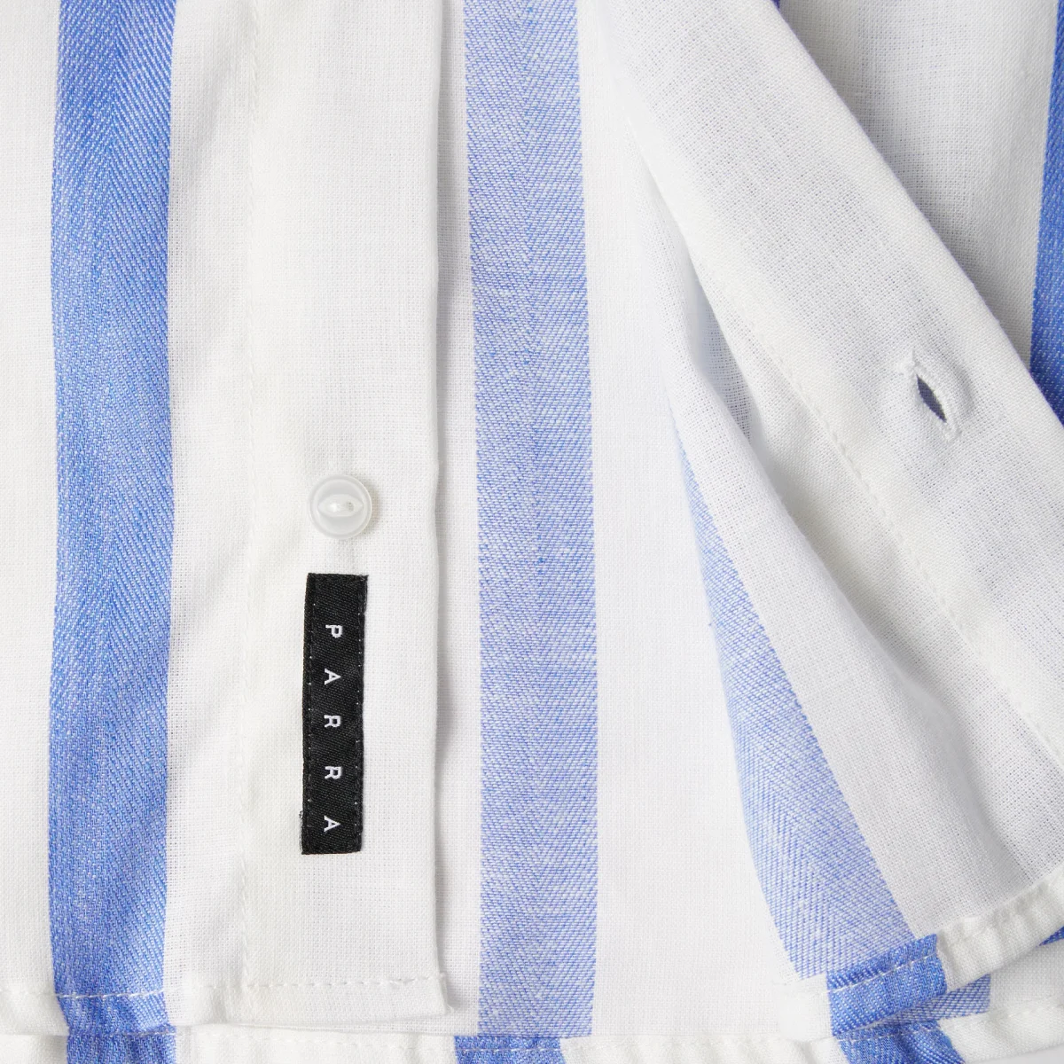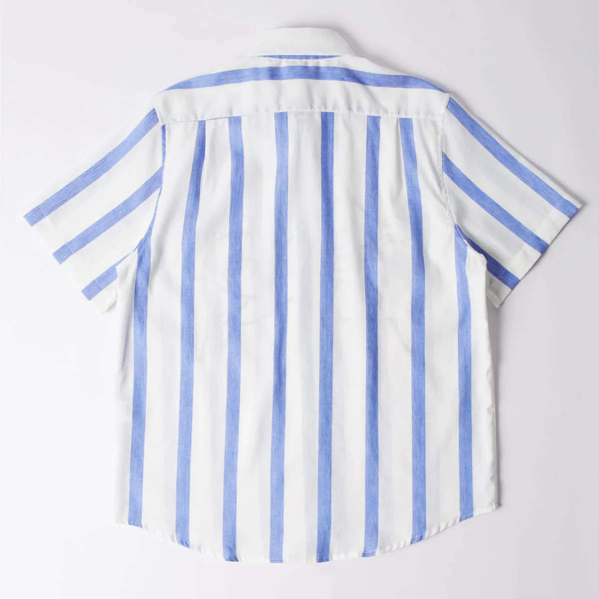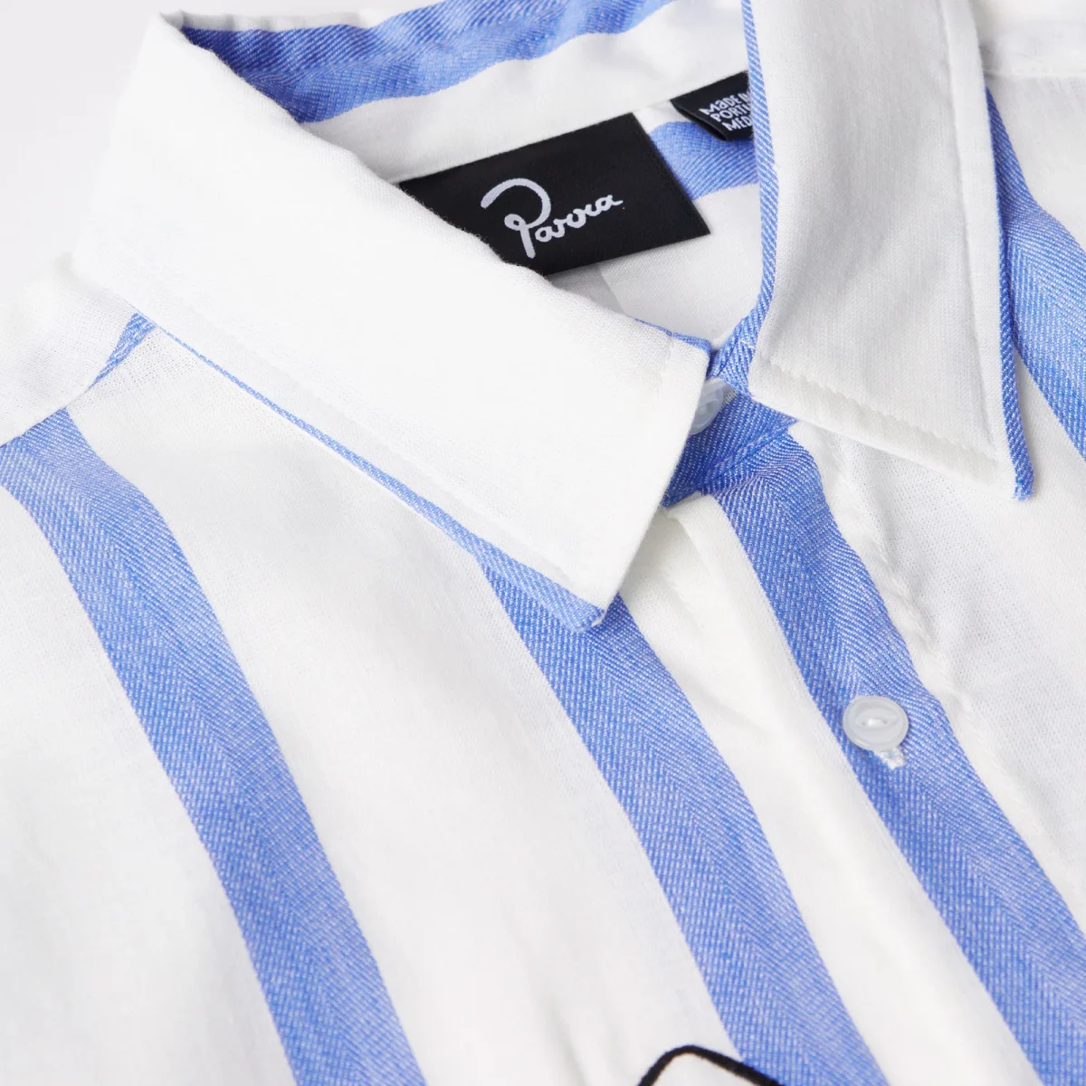 Chemise Parra manches courtes à rayures, coupe classique, fabrication en mélange de lin et visuel de l’artiste brodé sur le devant.