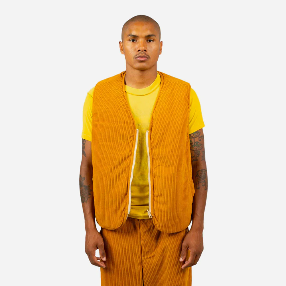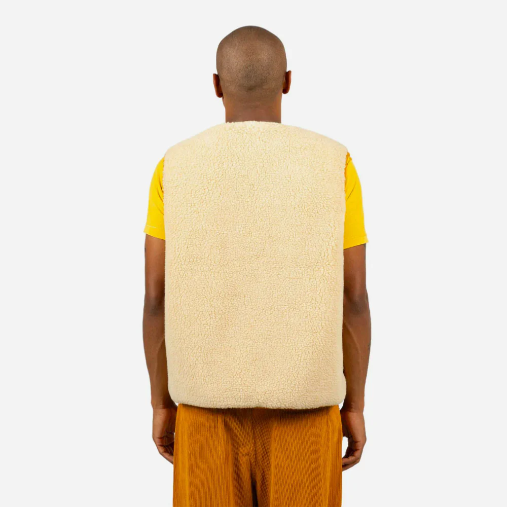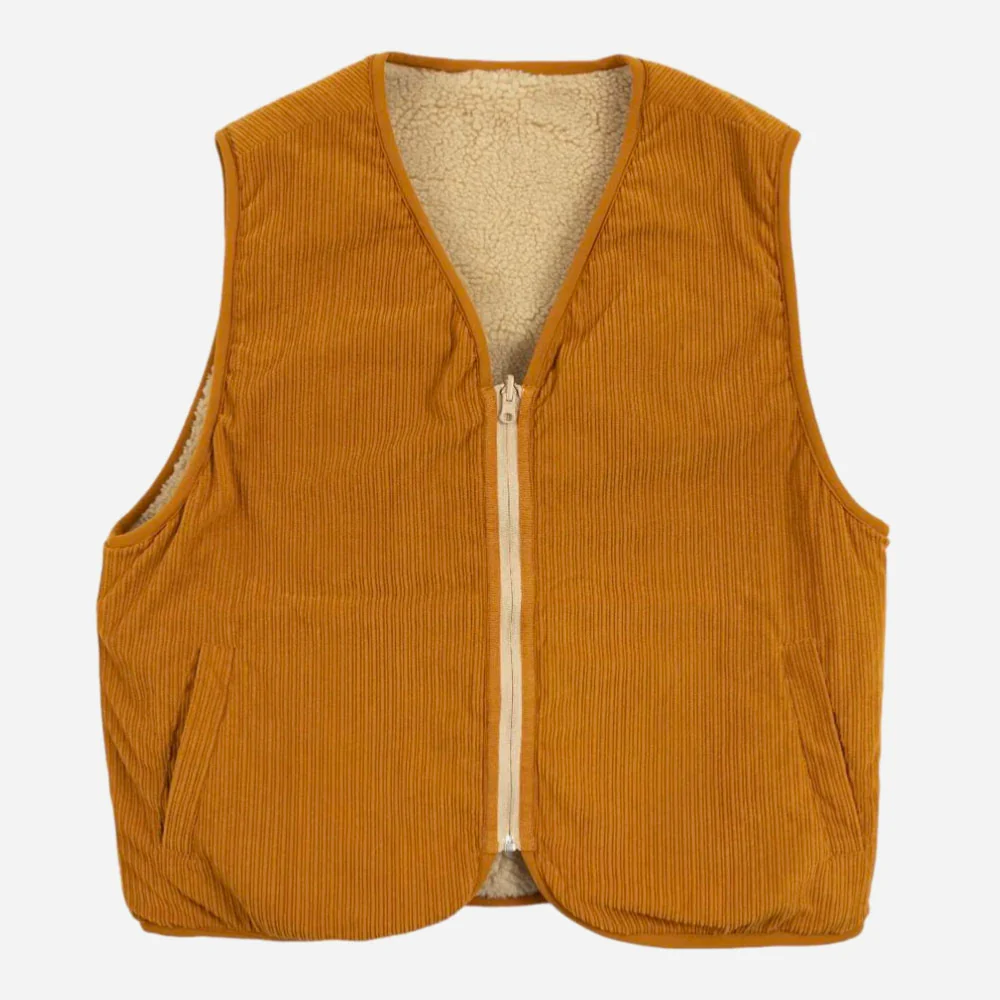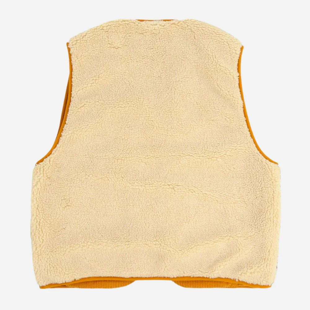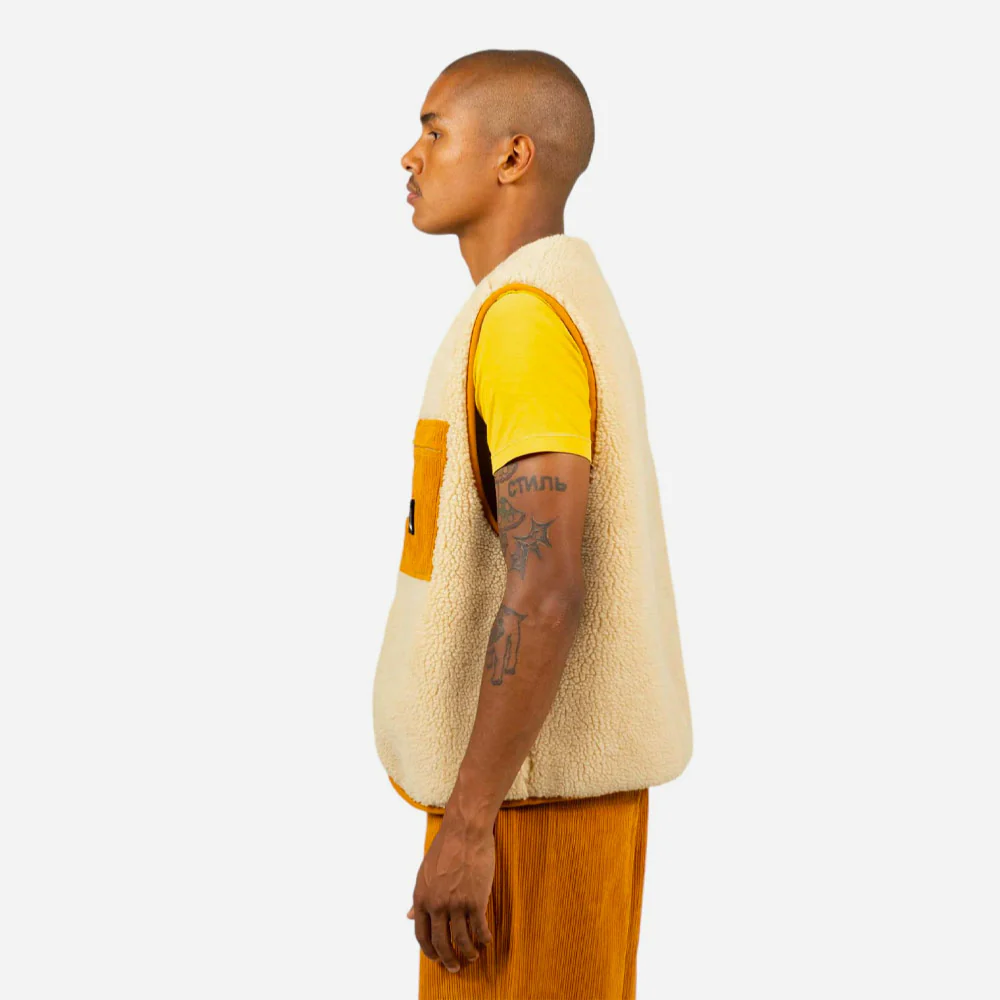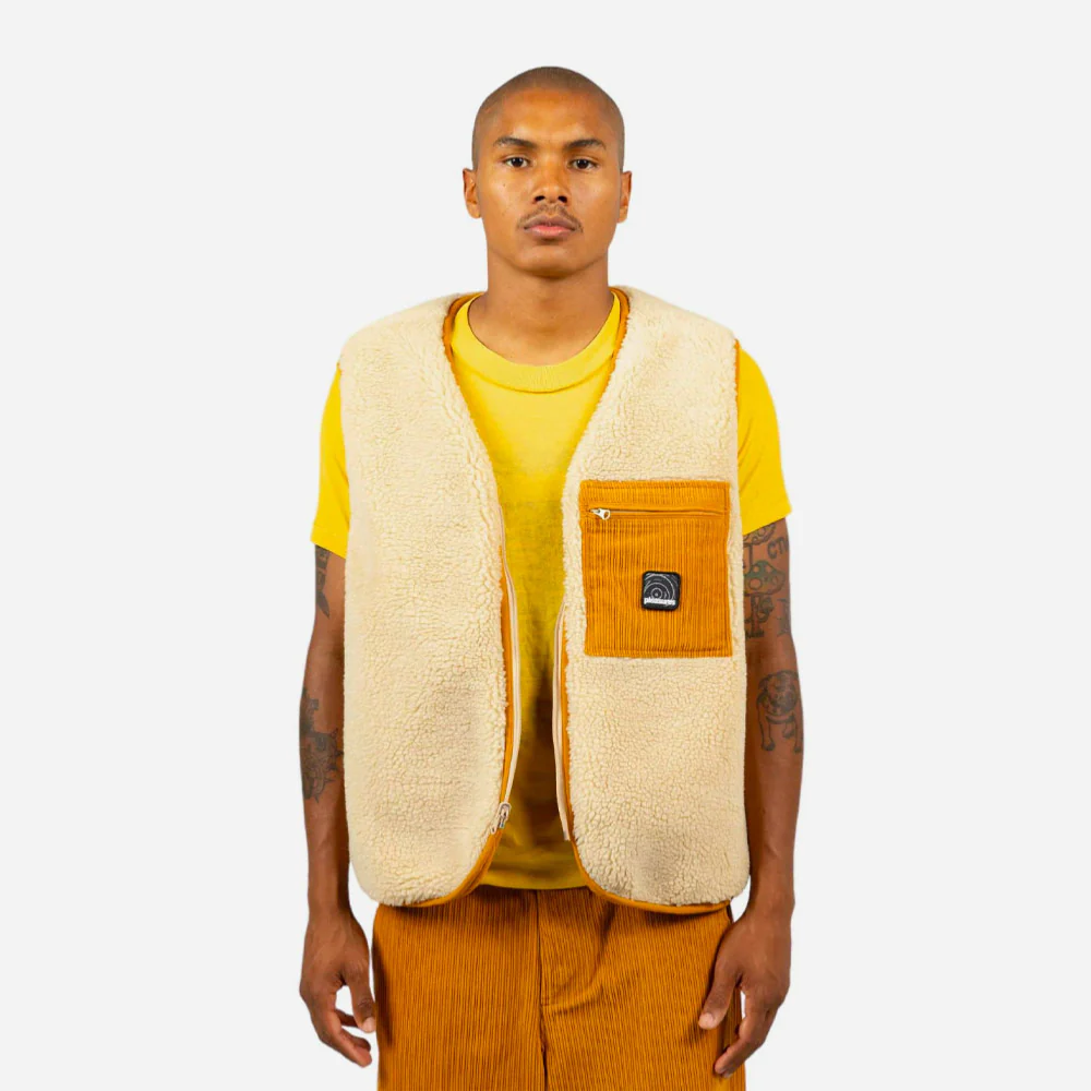 Gilet réversible, un coté sherpa et l’autre velours côtelé. Poche poitrine zippée avec patch scratch amovible, poches latérales invisibles.