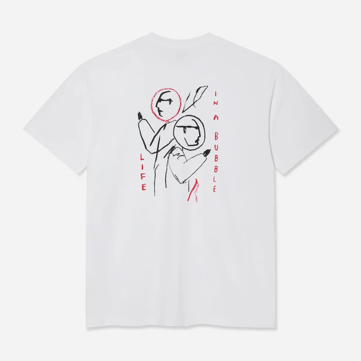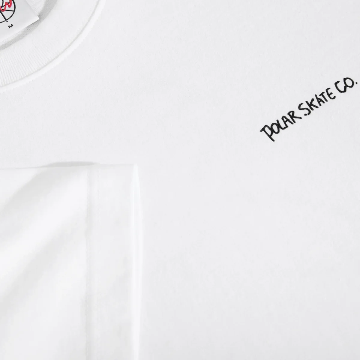 T-shirt Polar manches courte, coupe classique avec épaules légèrement tombantes et col ras du cou côtelé fabriqué dans un coton blanc épais pré-rétréci. Visuel par Pontus Alv sérigraphié dans le dos et logo Polar sur la poitrine.