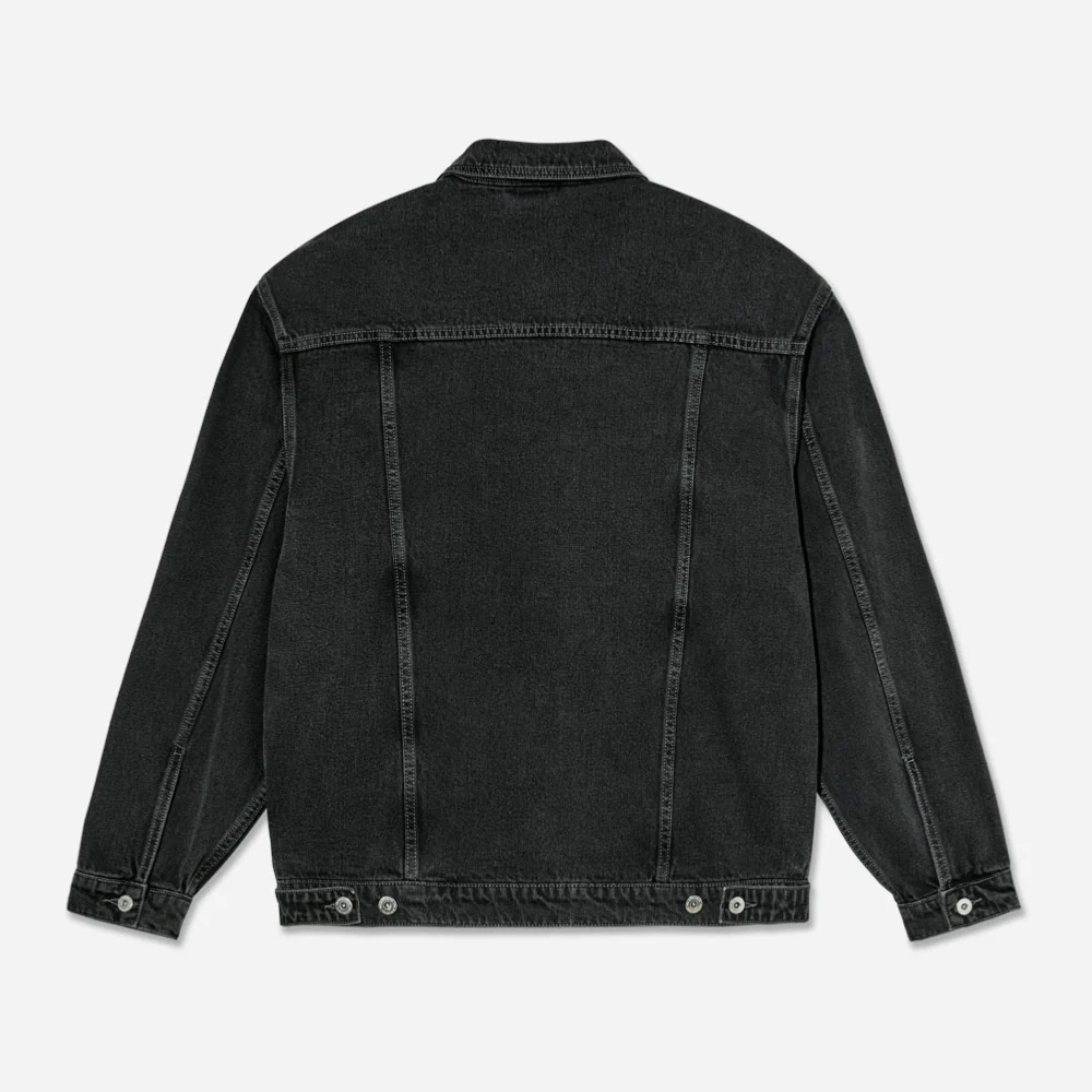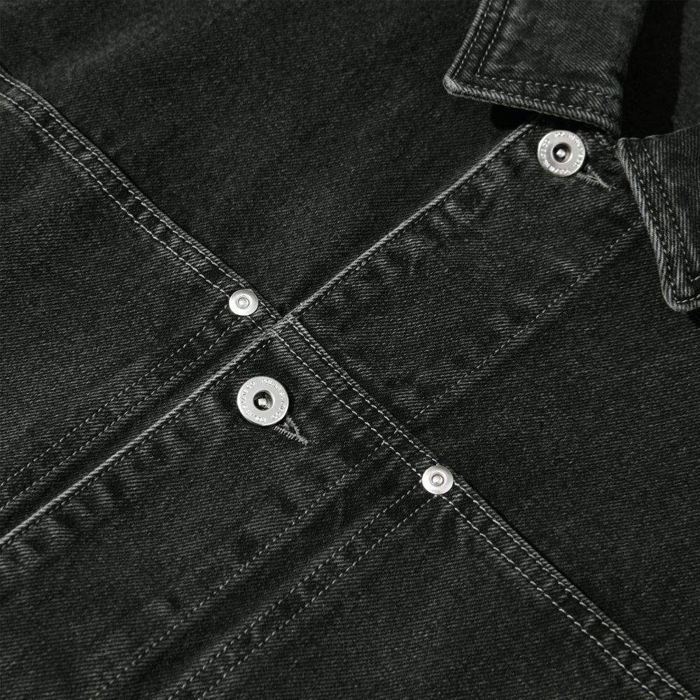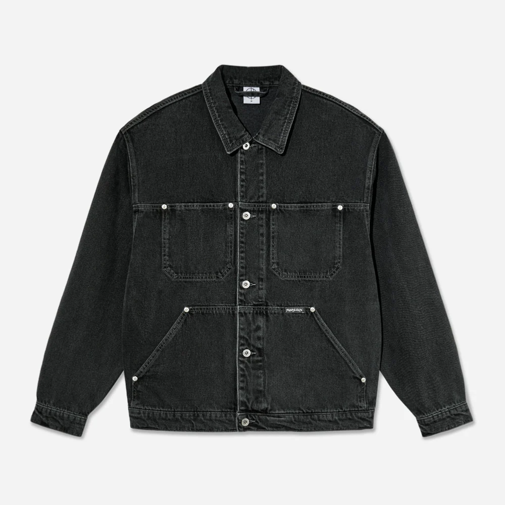 Veste en tissu sergé avec extérieur brossé et boutons personnalisés. Étiquette tissée et épaules tombantes. Coupe large et surdimensionnée.