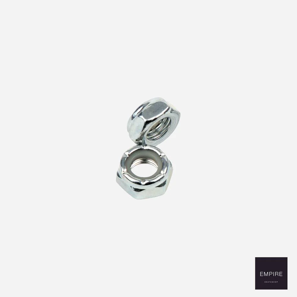 Jeu de deux écrous de remplacement pour axes de trucks de skate. Taille standard en acier chromé avec filetage anti-retour.