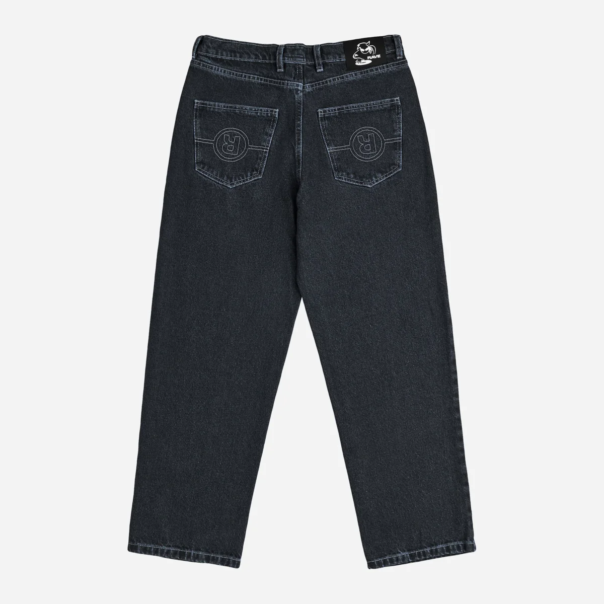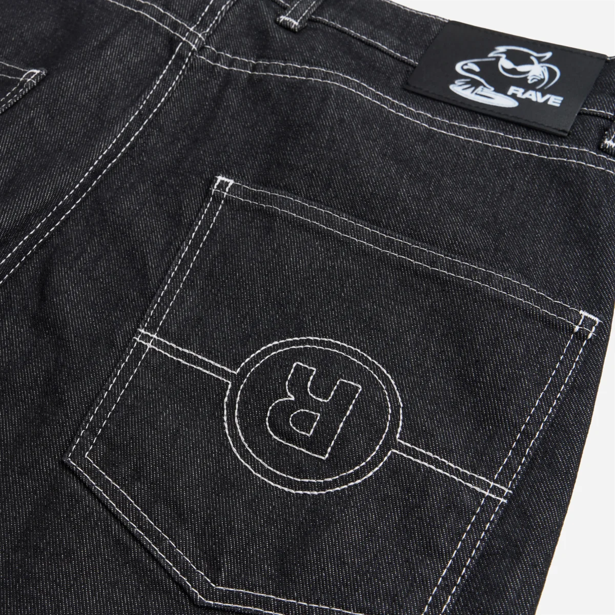 Jean en coton noir brut. Coupe relax. Logo Rave sur-piqué sur les poches arrières. Broderie sur la poche avant.