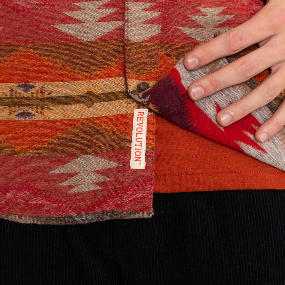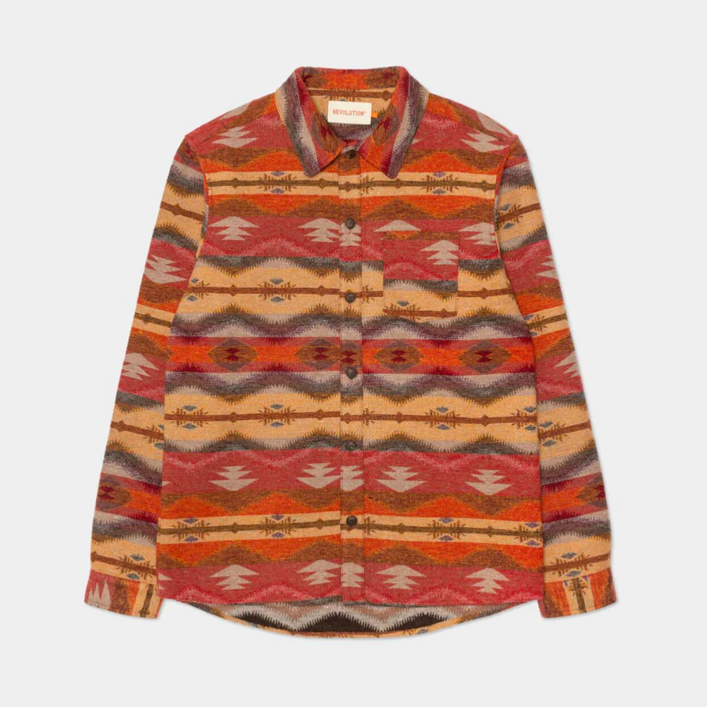 Surchemise à manches longues au motif tissé d’inspiration aztèque, avec poche poitrine, étiquette de marque sur la patte de boutonnage intérieure et fermeture à bouton.