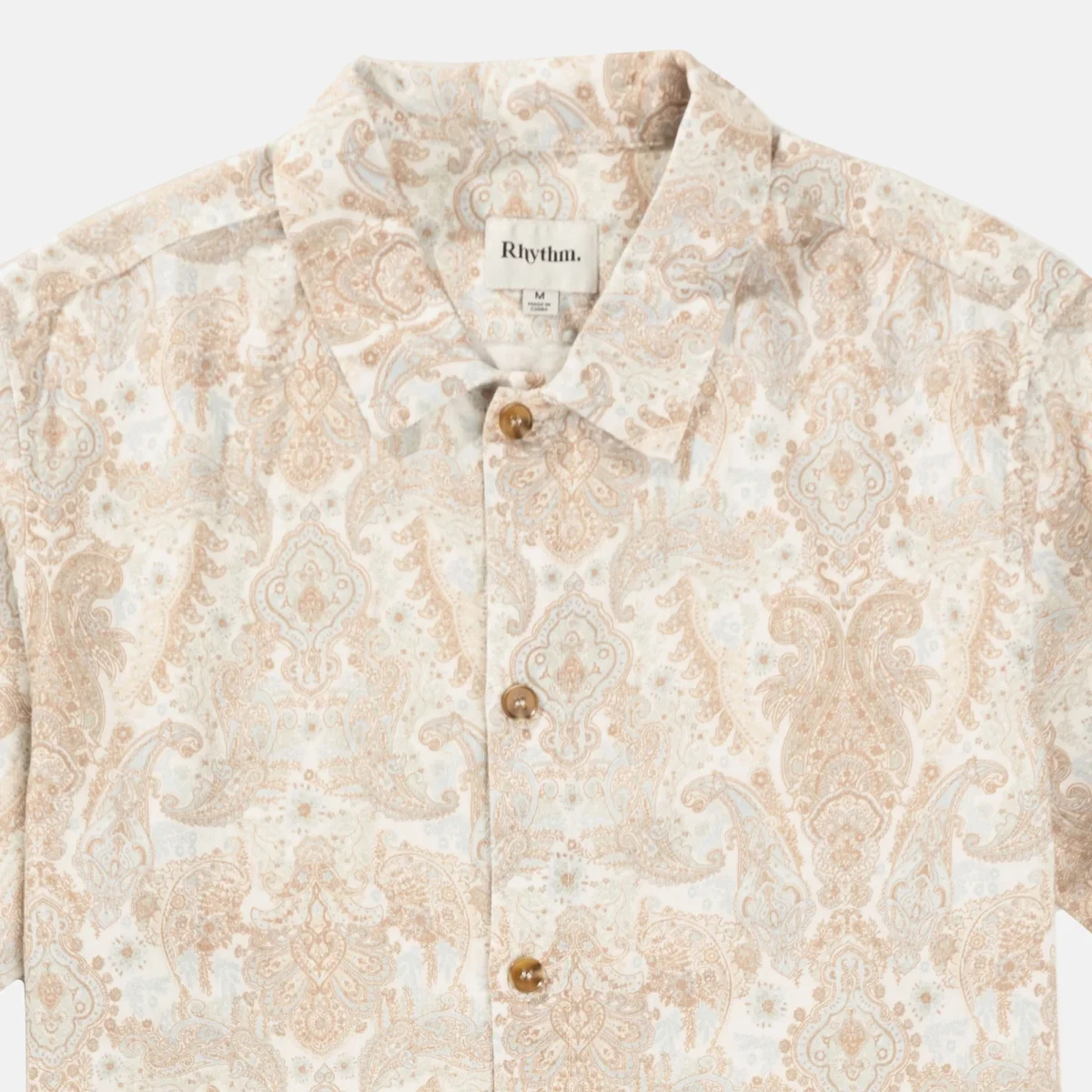 Chemise manches courtes Rhythm à motif Paisley. Coupe boxy décontractée avec épaules tombantes et ourlet droit pour un look contemporain, fermeture par boutons imitation écaille de tortues. Petite étiquette Rhythm sur la couture latérale au-dessus de l’ourlet.