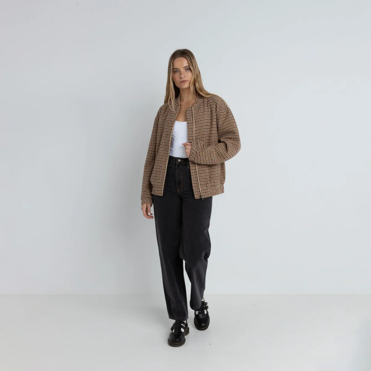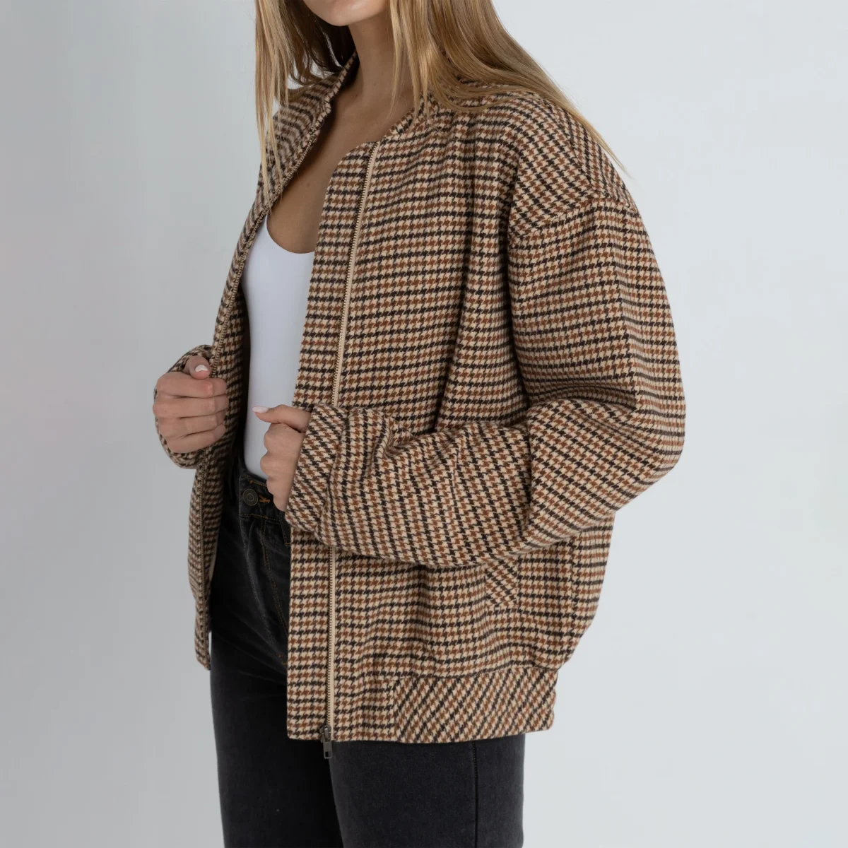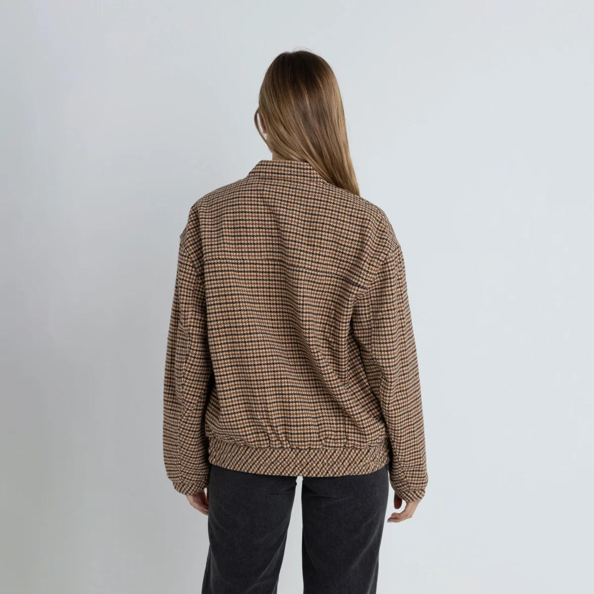 Veste bomber Rhythm pour femme. Coupe bomber moderne oversize, avec un col montant à bande et une fermeture à glissière sur le devant. Elle est confectionnée dans un un tissu tweed à motif pied-de-poule, mélange de laine et polyester.