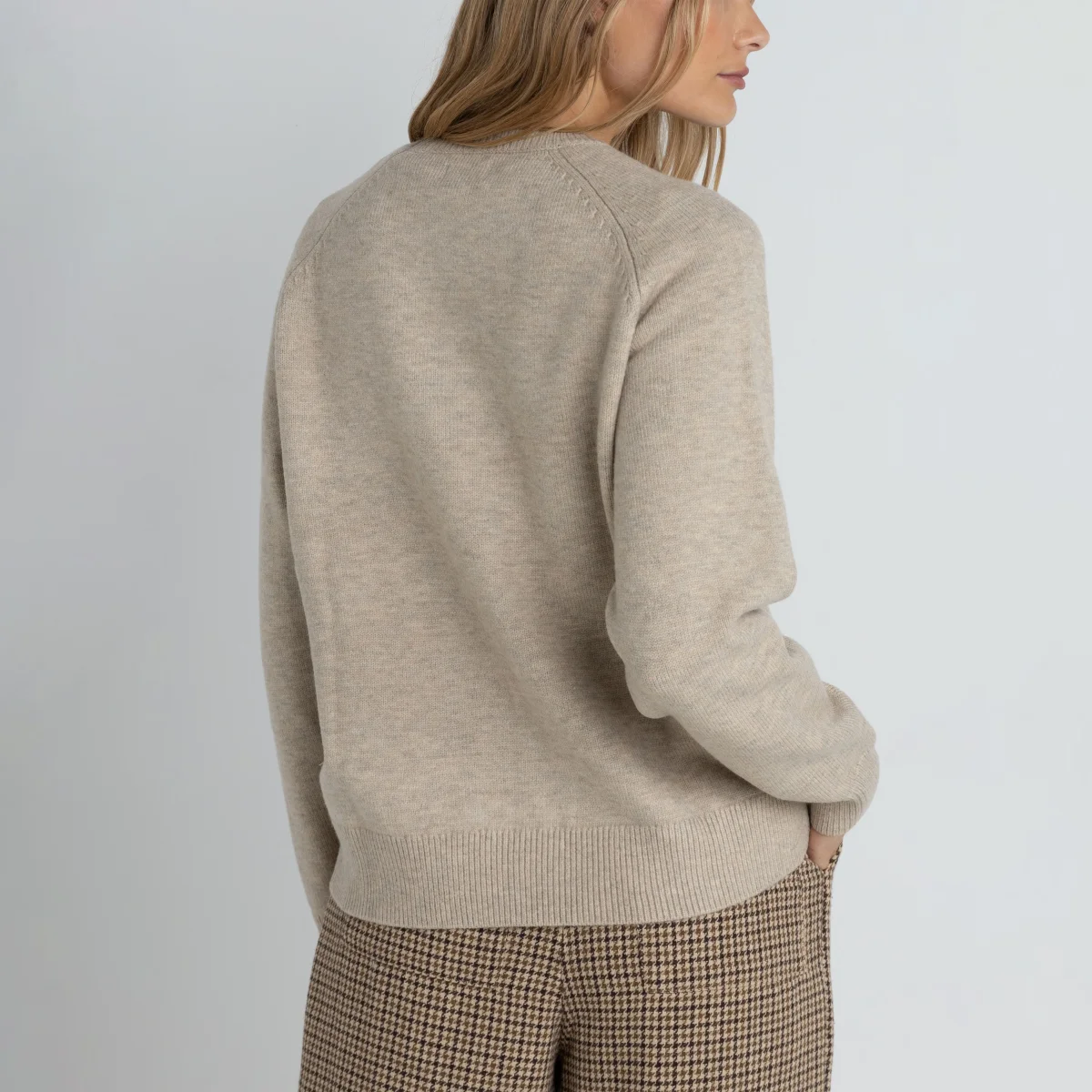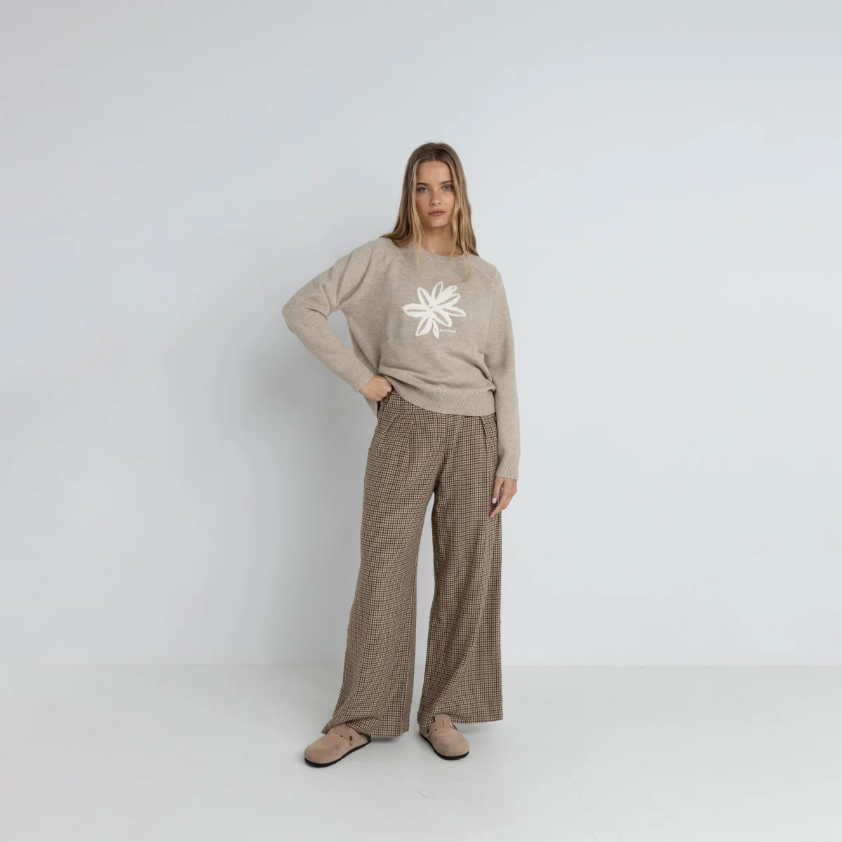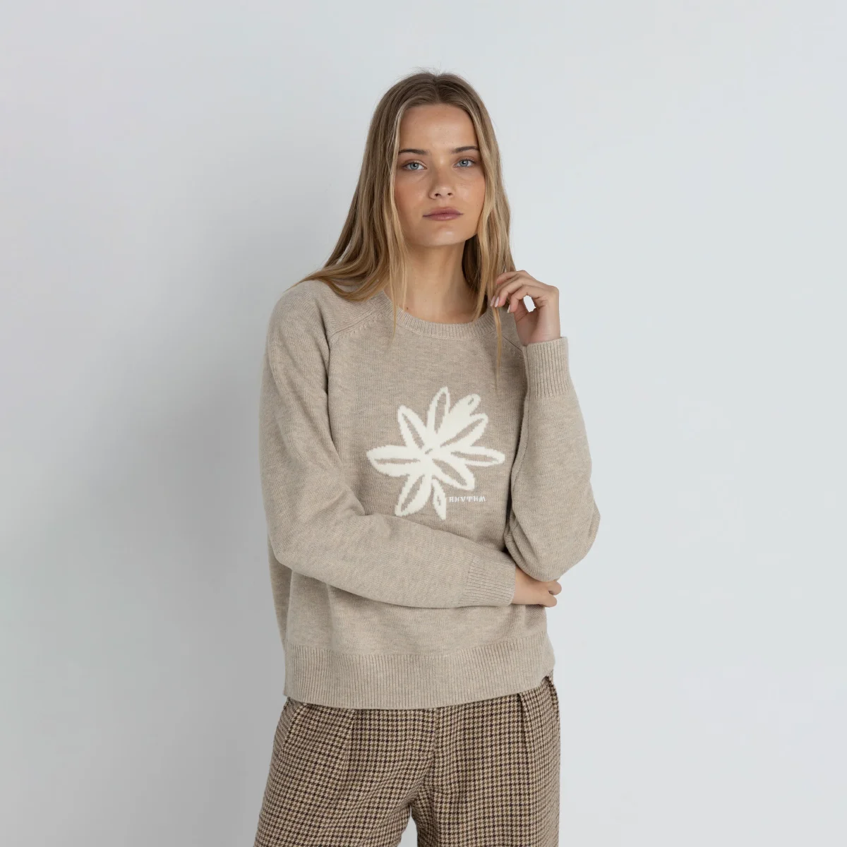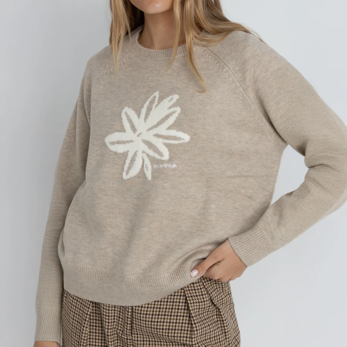 Pull Rhythm à col ras du cou, confectionné dans un fil de marle doux de poids moyen, il présente une coupe décontractée, des manches raglan et une fleur jacquard.