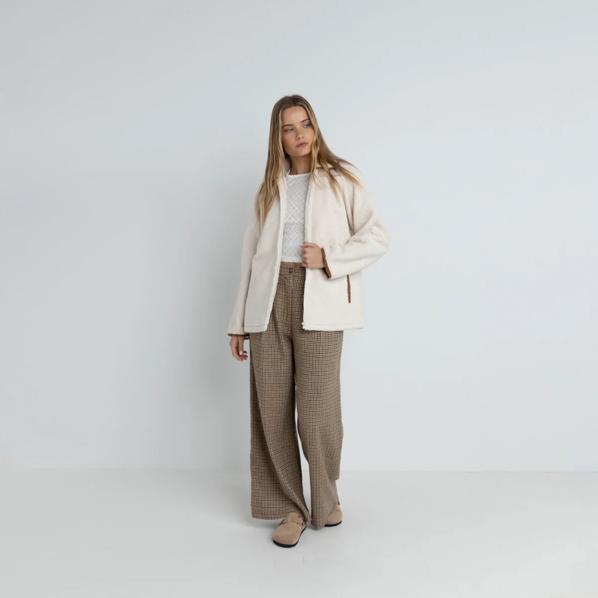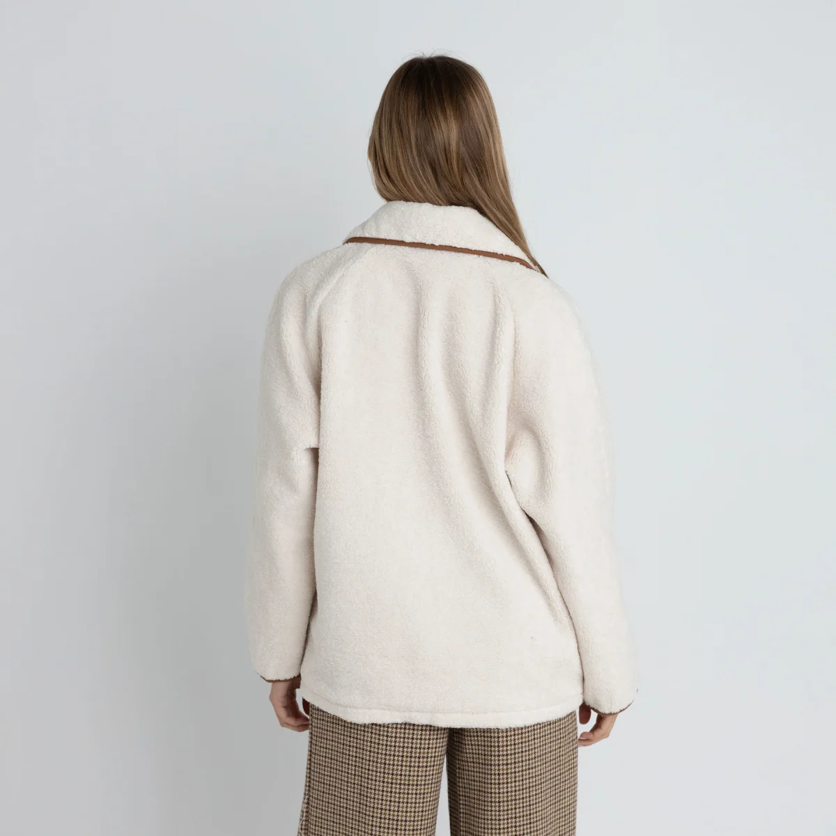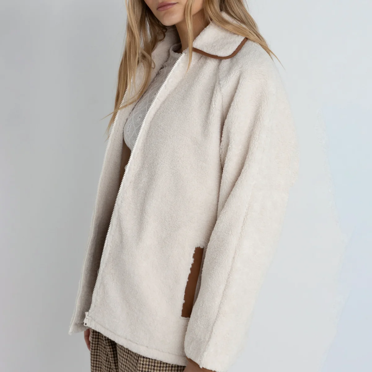 Veste Rhythm pour femme, confectionnée en sherpa ultra-douce, elle présente une coupe oversize décontractée, un col claudine avec bordures contrastées et une fermeture à glissière sur le devant. Avec ses manches raglan et ses poches doublées pour garder vos mains au chaud, elle est parfaite pour cette nouvelle saison.