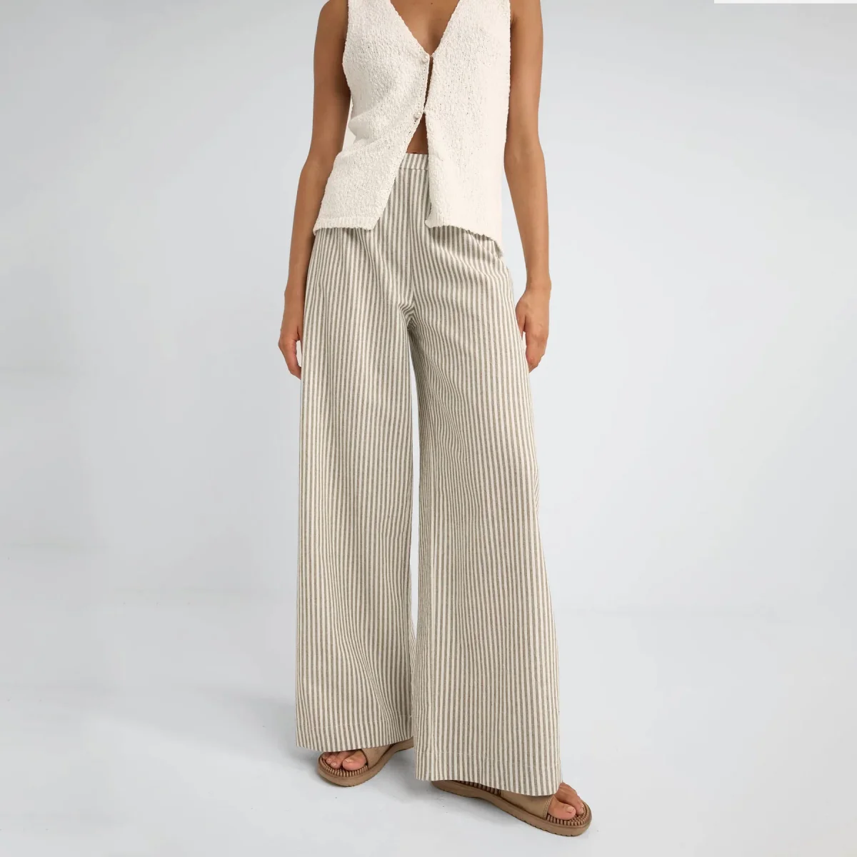 Pantalon Rhythm pour femmes, coupe coupe extra large pour une silhouette résolument moderne. Fabriquée en pur coton à rayures vertes.