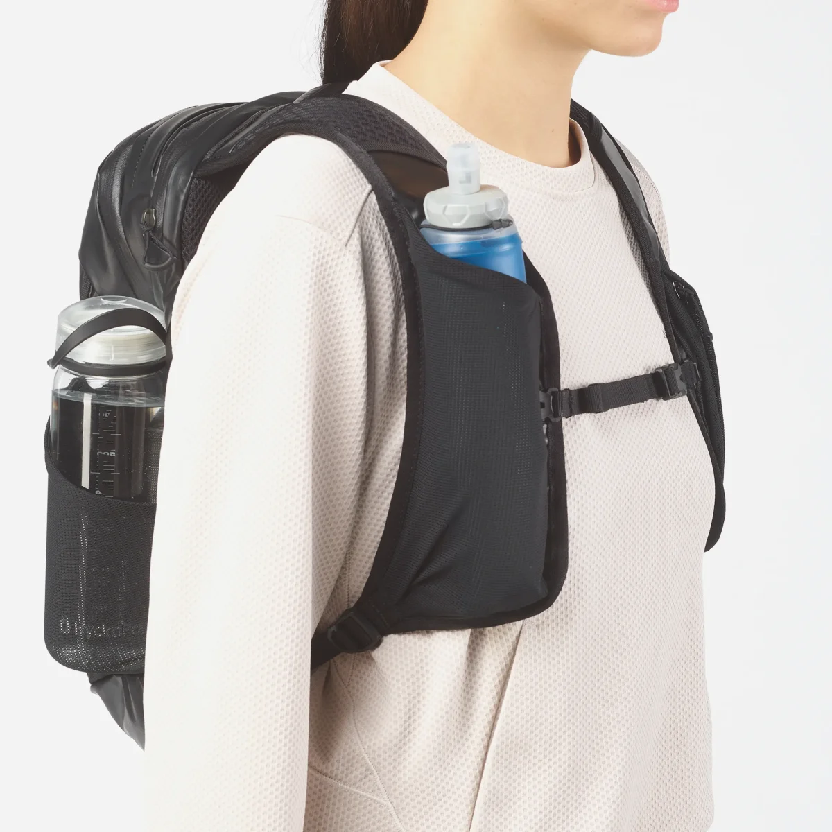 • ADN Trail Running : On retrouve les bretelles ergonomiques signature de Salomon avec poches pour softflask (500ml) ou téléphone, permettant un accès immédiat à votre hydratation ou vos clés.