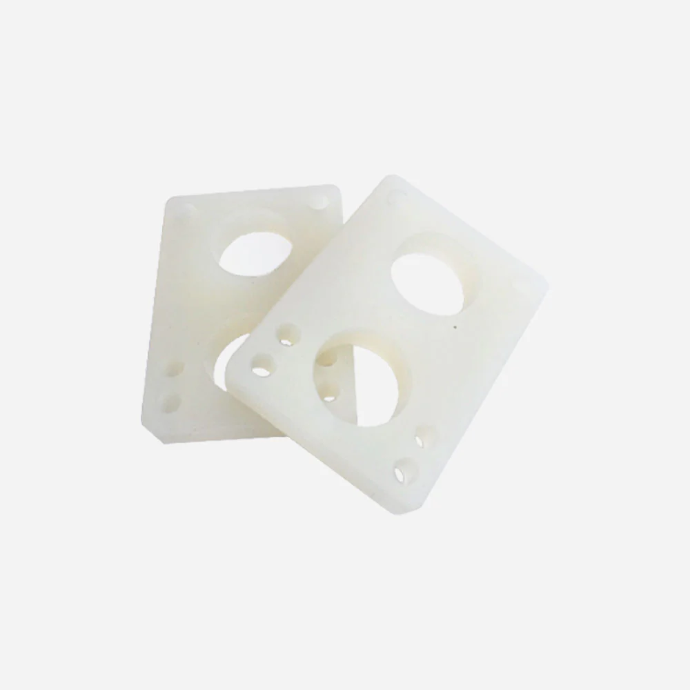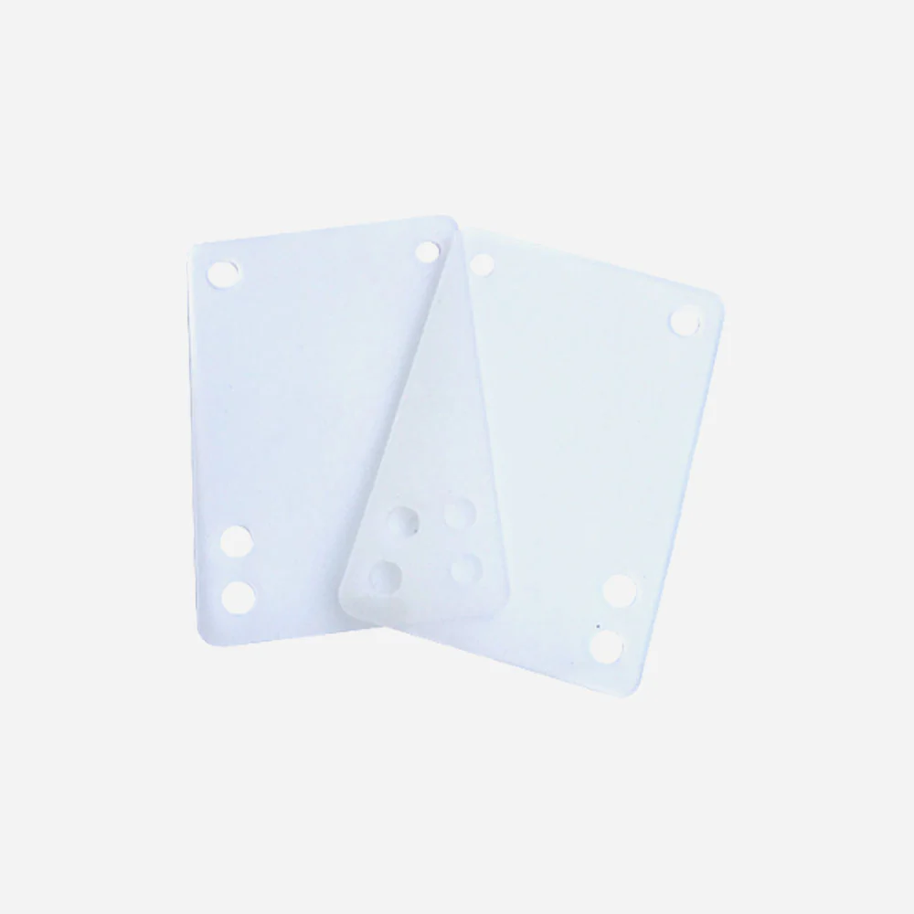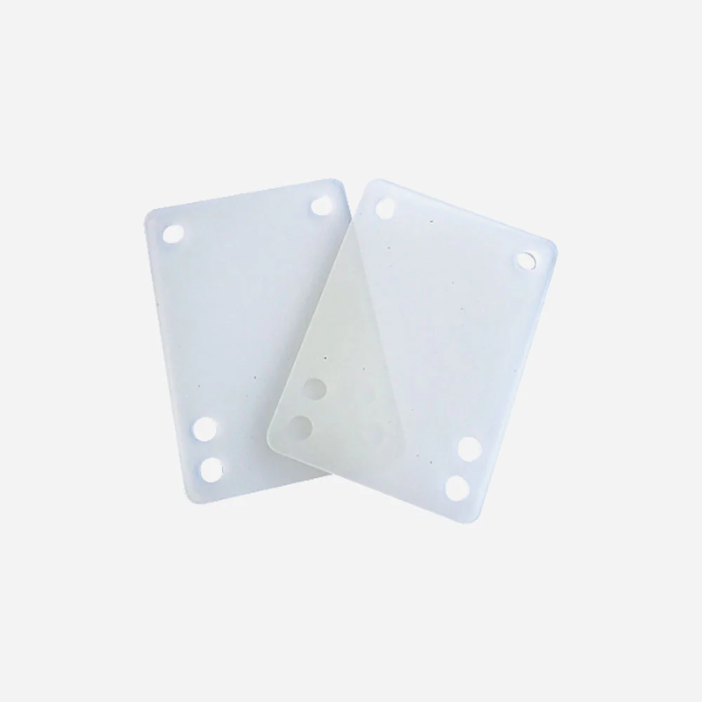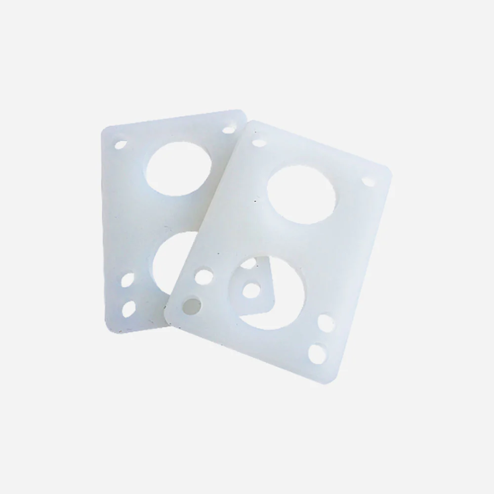 Jeu de 2 pads standards pour skateboards, dureté 75 (souple). Parfait pour rehausser vos trucks, éviter de mordre votre planche avec les grands diamètres de roues et absorber les vibrations.