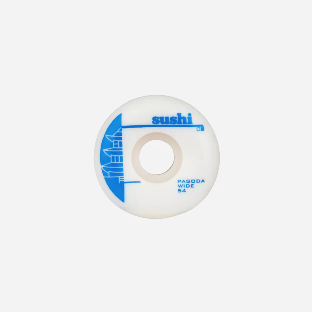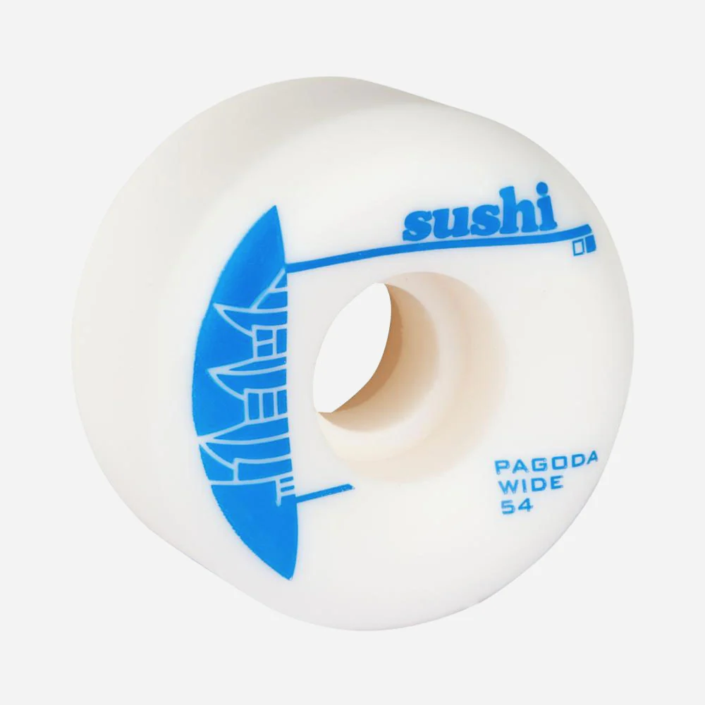 Jeu de 4 roues Sushi Pagoda pour skateboard, fabriquées en uréthane blanche. Shape large, face avant sérigraphiée. Duro 99A.
