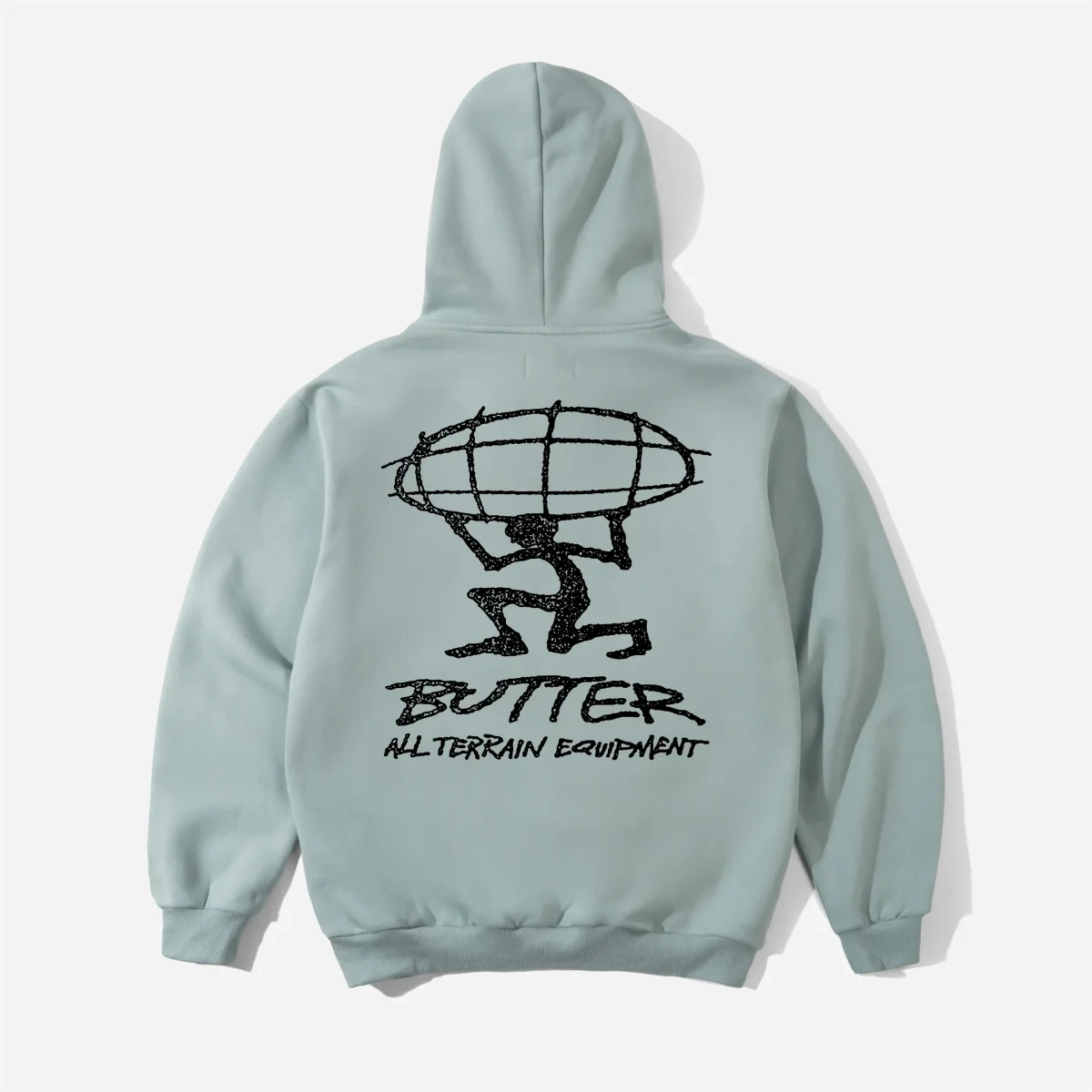 Graphisme « Atlas » : Il arbore des sérigraphies percutantes sur le devant et dans le dos. L’illustration, dessinée au trait, représente un personnage soutenant une structure en forme de globe terrestre, surplombant le logo « BUTTER » et la mention « ALL TERRAIN EQUIPMENT ».