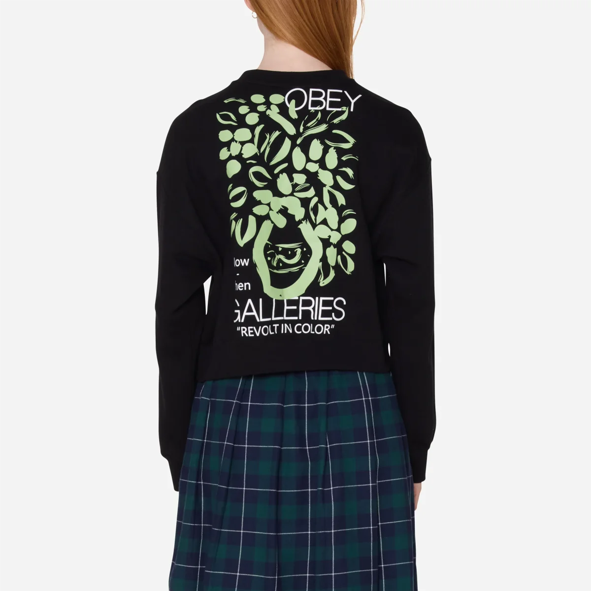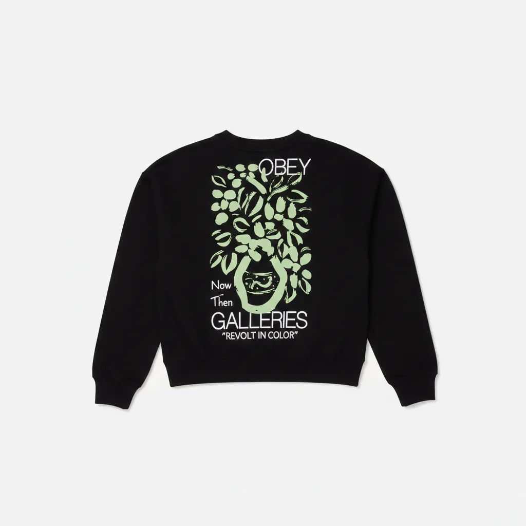 Graphismes Signatures : L’avant reste sobre avec un lettrage « OBEY GALLERIES » sur la poitrine, tandis que le dos dévoile une grande sérigraphie florale abstraite verte avec le slogan « Revolt in Color ».