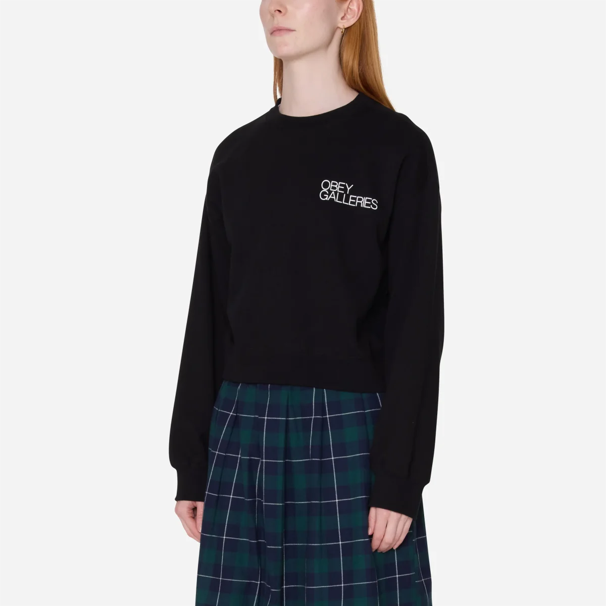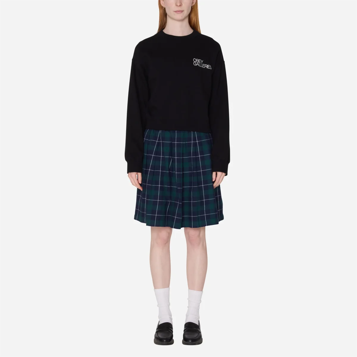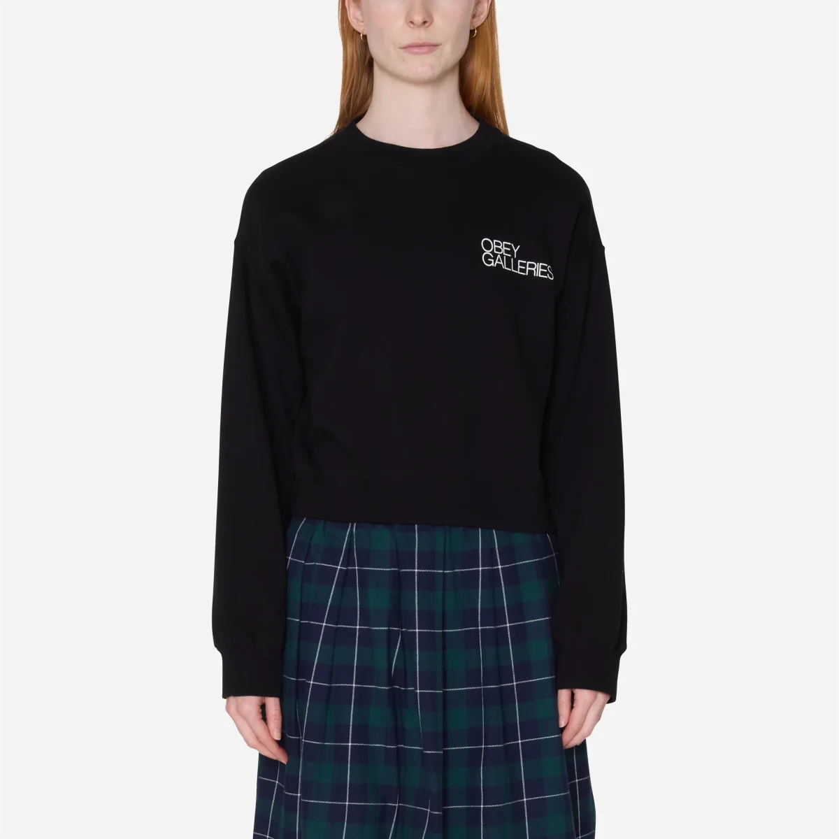 La coupe courte de ce sweat le destine naturellement aux bas taille haute. Pour reproduire l’esthétique du lookbook (vibe « schoolgirl grunge »), portez-le au-dessus d’une jupe plissée à carreaux et de mocassins avec des chaussettes blanches. Pour un look plus street, associez-le au jean baggy Obey Leah III.