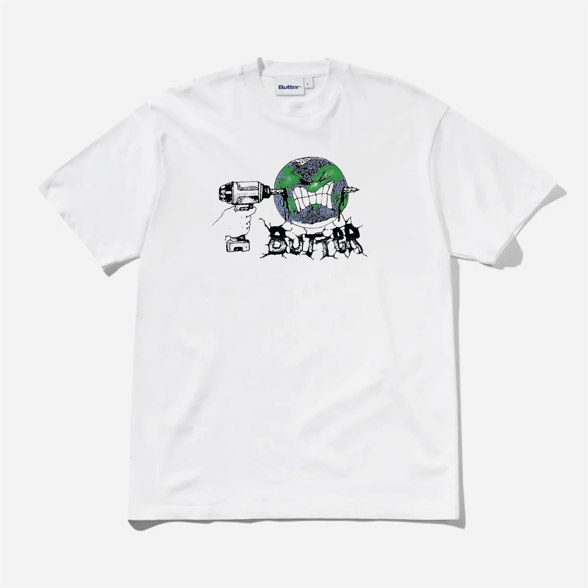 Illustration « Drill » : Le t-shirt arbore une grande sérigraphie sur l’avant. On y découvre une illustration rugueuse et texturée montrant une main en train de percer une planète Terre grimaçante à l’aide d’une perceuse, faisant voler en éclats le logo « BUTTER » situé en dessous.