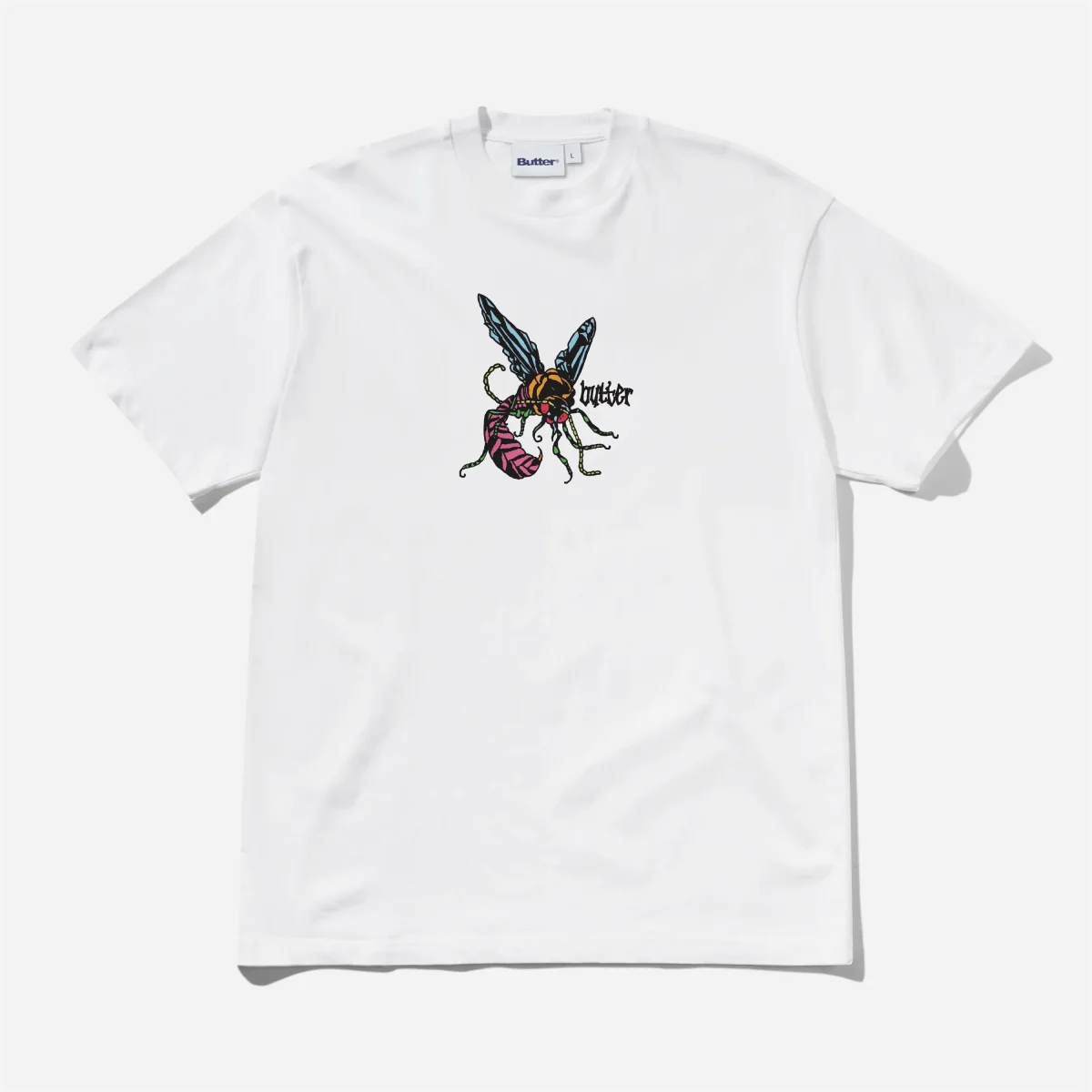 Illustration « Wasp » : Le vêtement affiche une sérigraphie de haute qualité sur l’avant. Centré sur la poitrine, le visuel présente une guêpe (wasp) stylisée aux teintes vibrantes de rose, de bleu et de vert, accompagnée du lettrage « butter » dans une police à l’allure gothique.