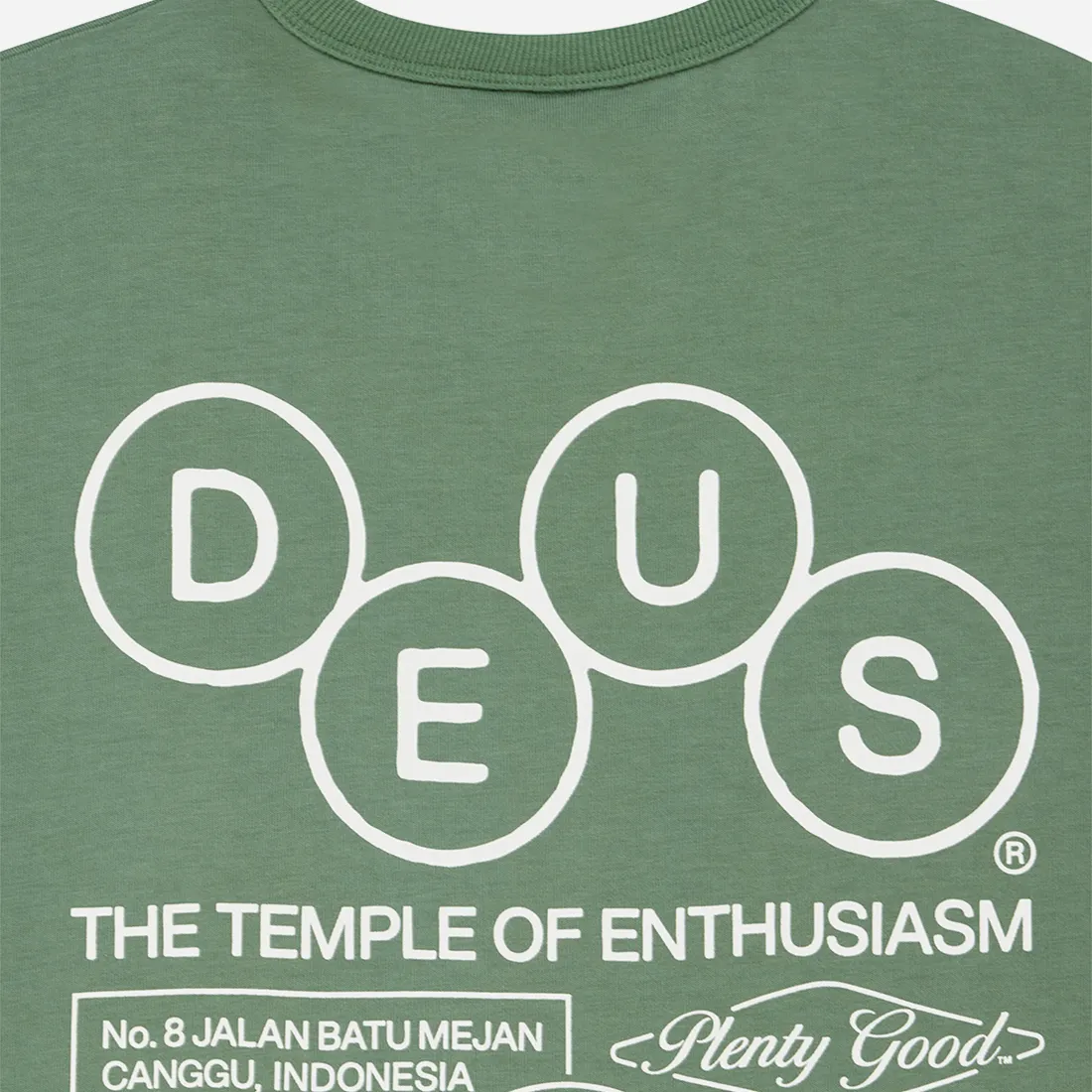 - Back Print « Address » : Le dos révèle l’identité complète du lieu avec l’inscription « THE TEMPLE OF ENTHUSIASM » et l’adresse mythique : No. 8 Jalan Batu Mejan, Canggu, Indonesia. Le tout accompagné du slogan « Plenty Good ».