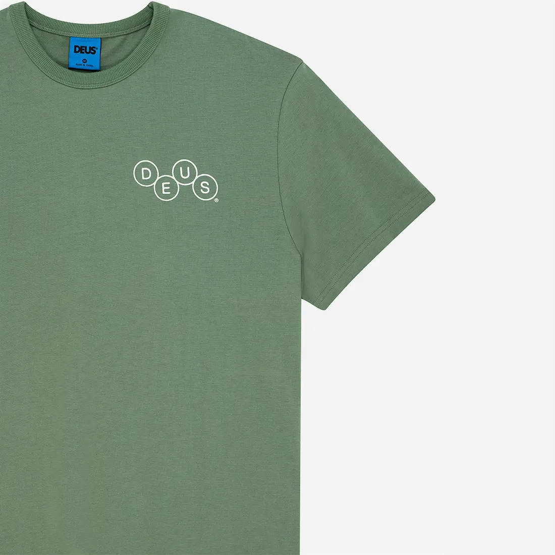 - Logo Poitrine : À l’avant, le logo « DEUS » est imprimé en blanc avec une typographie circulaire épurée sur le cœur, simple et efficace.