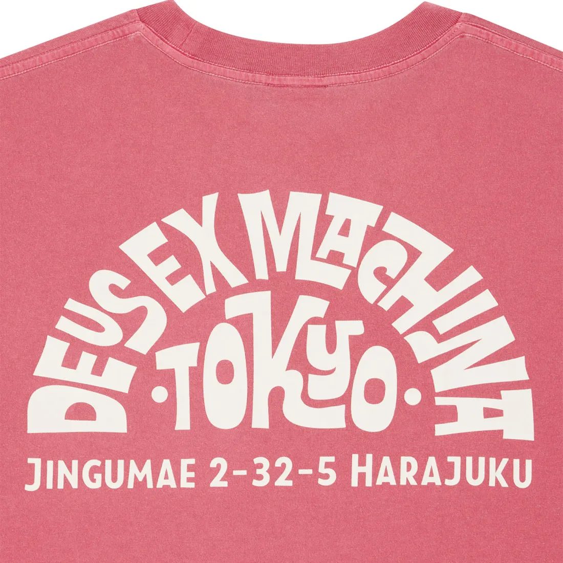 Le Graphisme « Address » : Le dos arbore l’impression signature de la marque en blanc crème : le logo « Deus Ex Machina » en arc de cercle surplombant la mention « Tokyo » et l’adresse exacte du magasin : Jingumae 2-32-5 Harajuku.