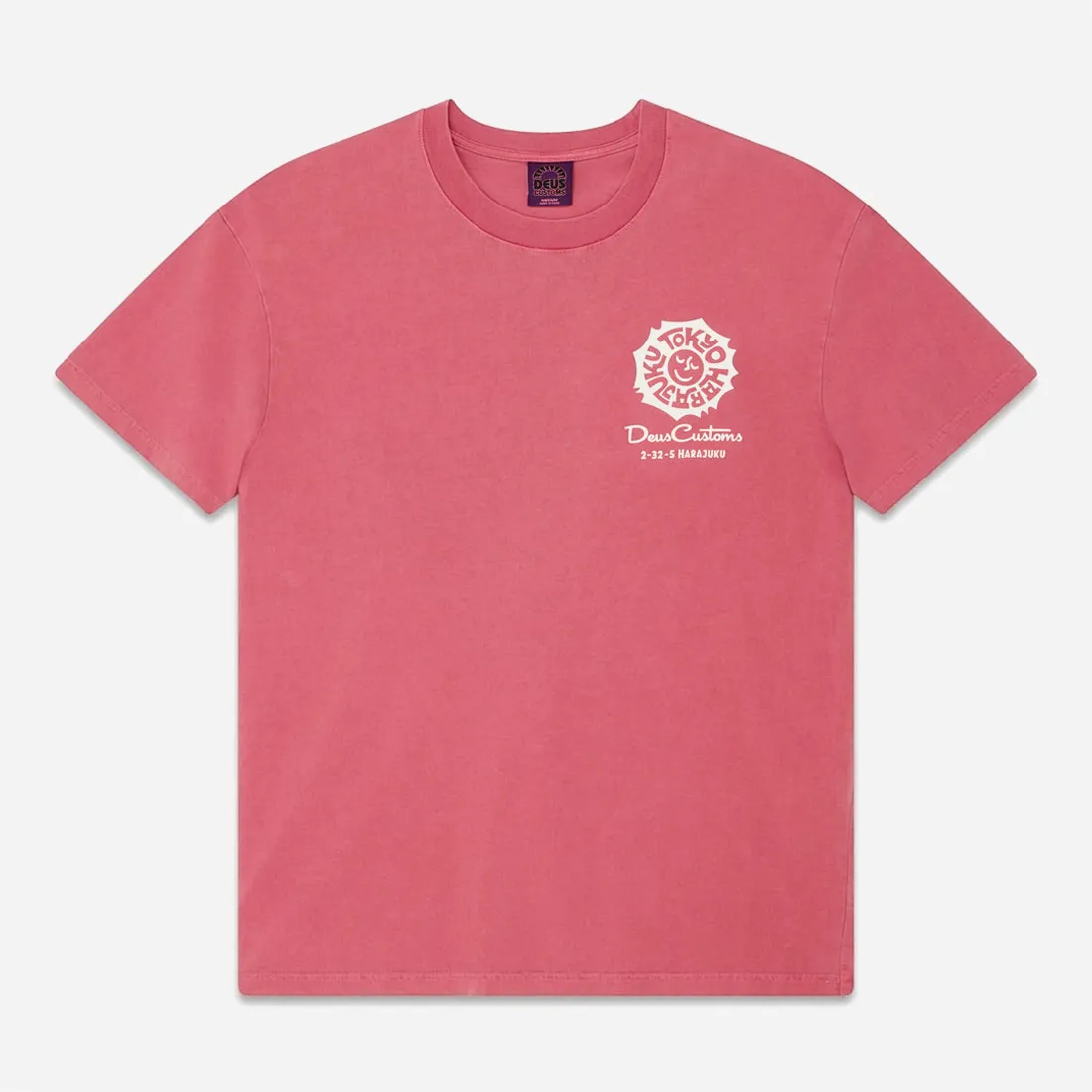 Logo Poitrine : L’avant reste sobre avec un petit écusson graphique « Tokyo Harajuku » et la mention « Deus Customs » imprimés sur la poitrine gauche.