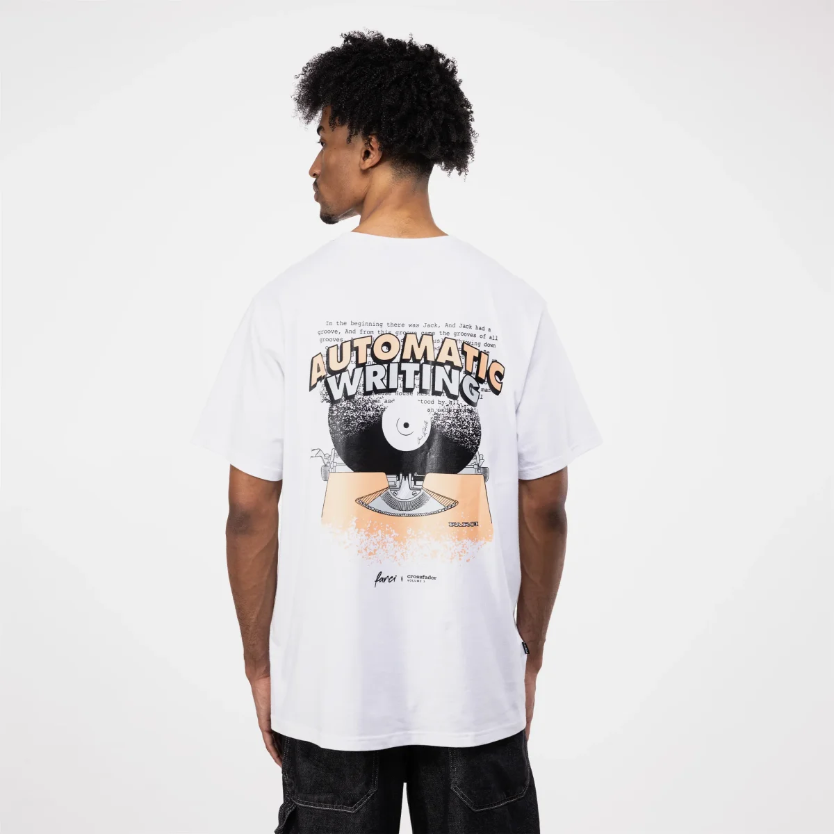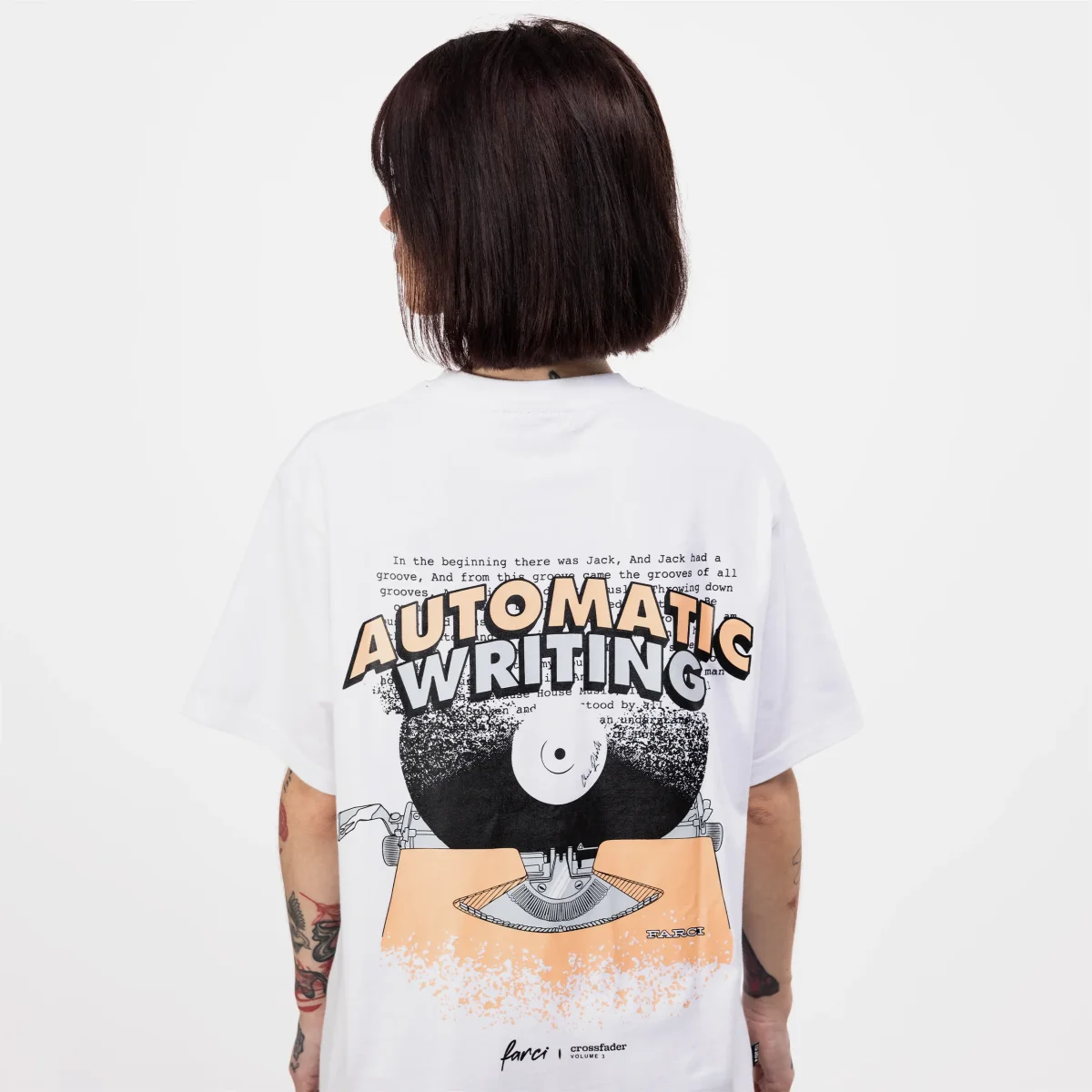 Avec le T-shirt Farci Automatic Tee, la marque continue d’explorer la scène électronique française à travers sa série « Crossfader ». Cette édition met en lumière Automatic Writing, un label et trio de DJs qui a su imposer un langage nocturne unique, où les textures sonores prennent le pas sur la conscience.