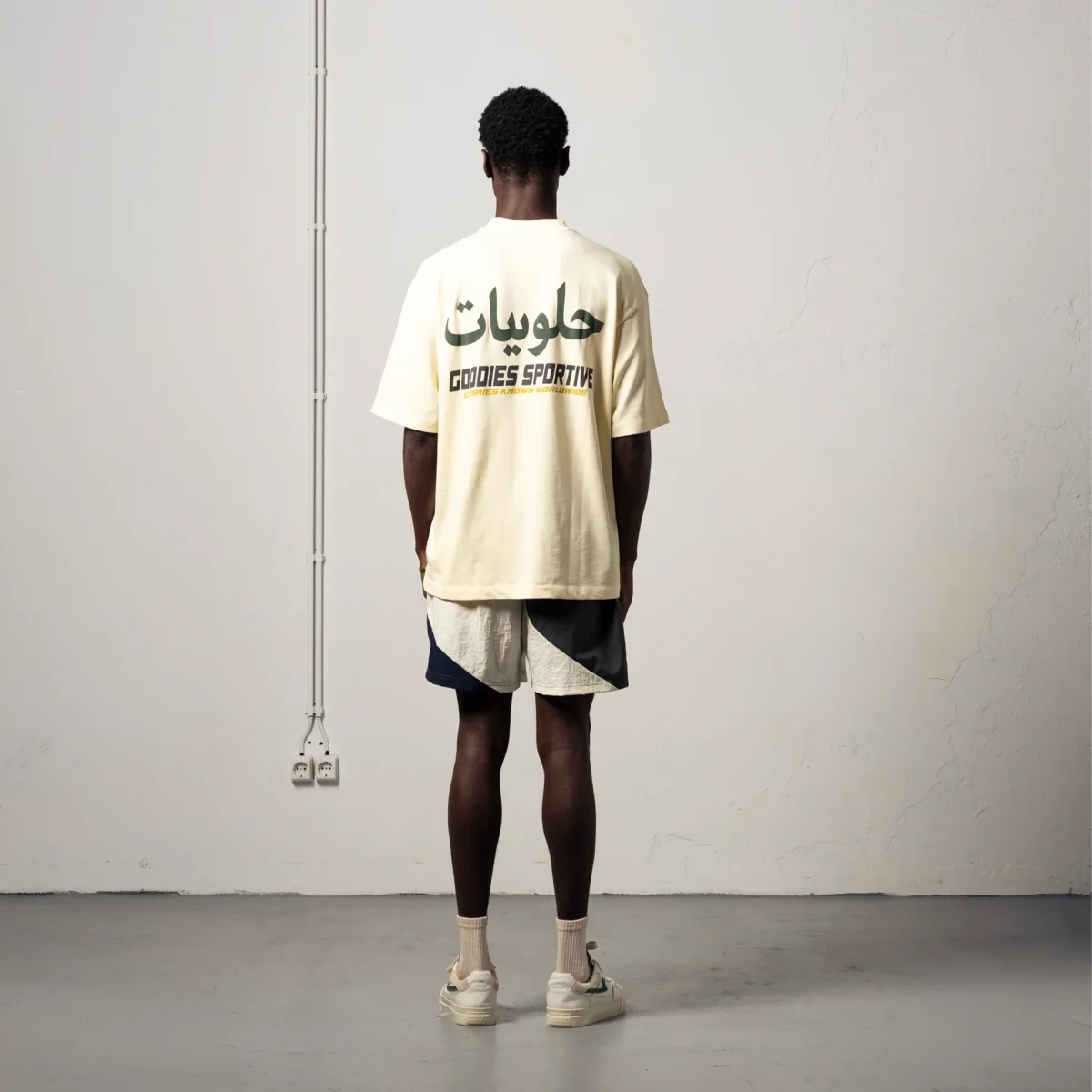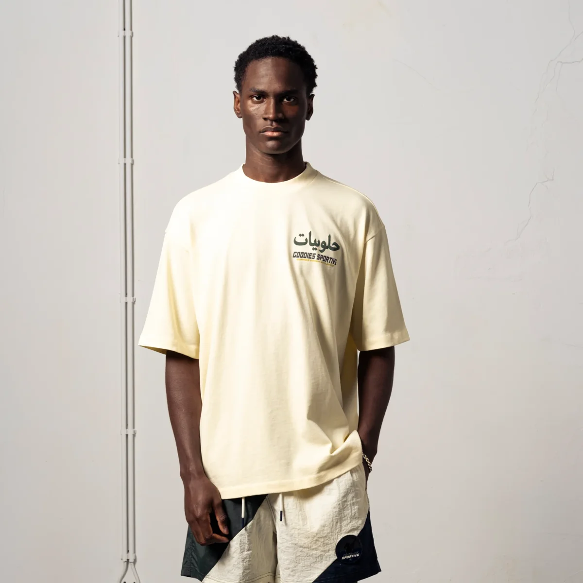 La couleur Butter se marie exceptionnellement bien avec des tons olive, kaki ou marine. Portez ce t-shirt ample sur un pantalon chino olive légèrement ample et ajoutez une paire de sneakers blanches pour un look « casual premium » très efficace.