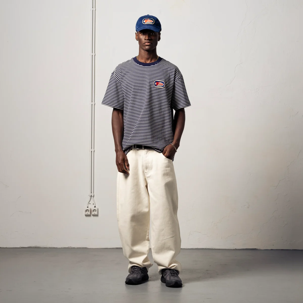 Grâce à son épaisseur et ses couleurs classiques, ce t-shirt se porte aussi bien avec un jean brut large et des Converse pour un look skate, qu’avec un pantalon chino beige et des mocassins pour un style « Preppy » décalé.